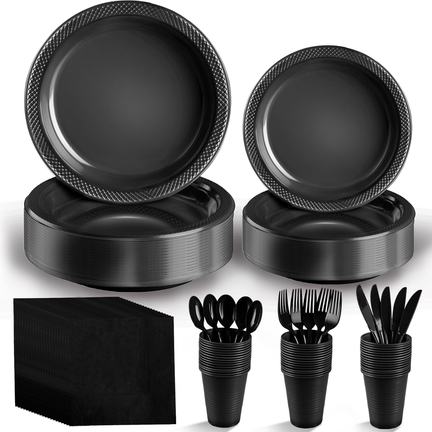• STURDY: This black disposable party supply set is designed to be both sturdy and reliable,making it perfect for any party. With its strong,durable construction,our disposable dinnerware set party supplies with black plates disposable for party,will hold up well throughout your event. Enjoy peace of mind knowing these black plastic plates and utensils are up to the task