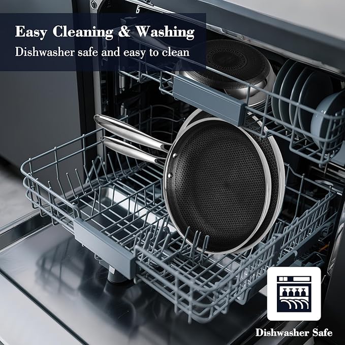 • 【Hybrid Non Stick Frying Pan Sets-No Sticking, Easy Scrubbing】 Upgrade to the Tibbicc non stick frying pan set for professional searing and effortless cleaning. The triple-layer stainless steel and aluminum core ensures even heat distribution, while the laser-etched scratch-resistant coating releases food instantly – eggs slide out and grease wipes clean without scraping. Durable enough for metal utensils and daily heavy use.