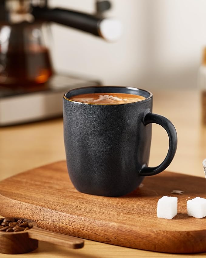 famiware Coffee Mugs Set of 6, Ocean Square 13oz Coffee Cup Set with Handle for Cocoa, Milk, Hot Chocolate, Tea, Water, Stoneware Cups for Kitchen, Microwave and Dishwasher Safe, Matte Black