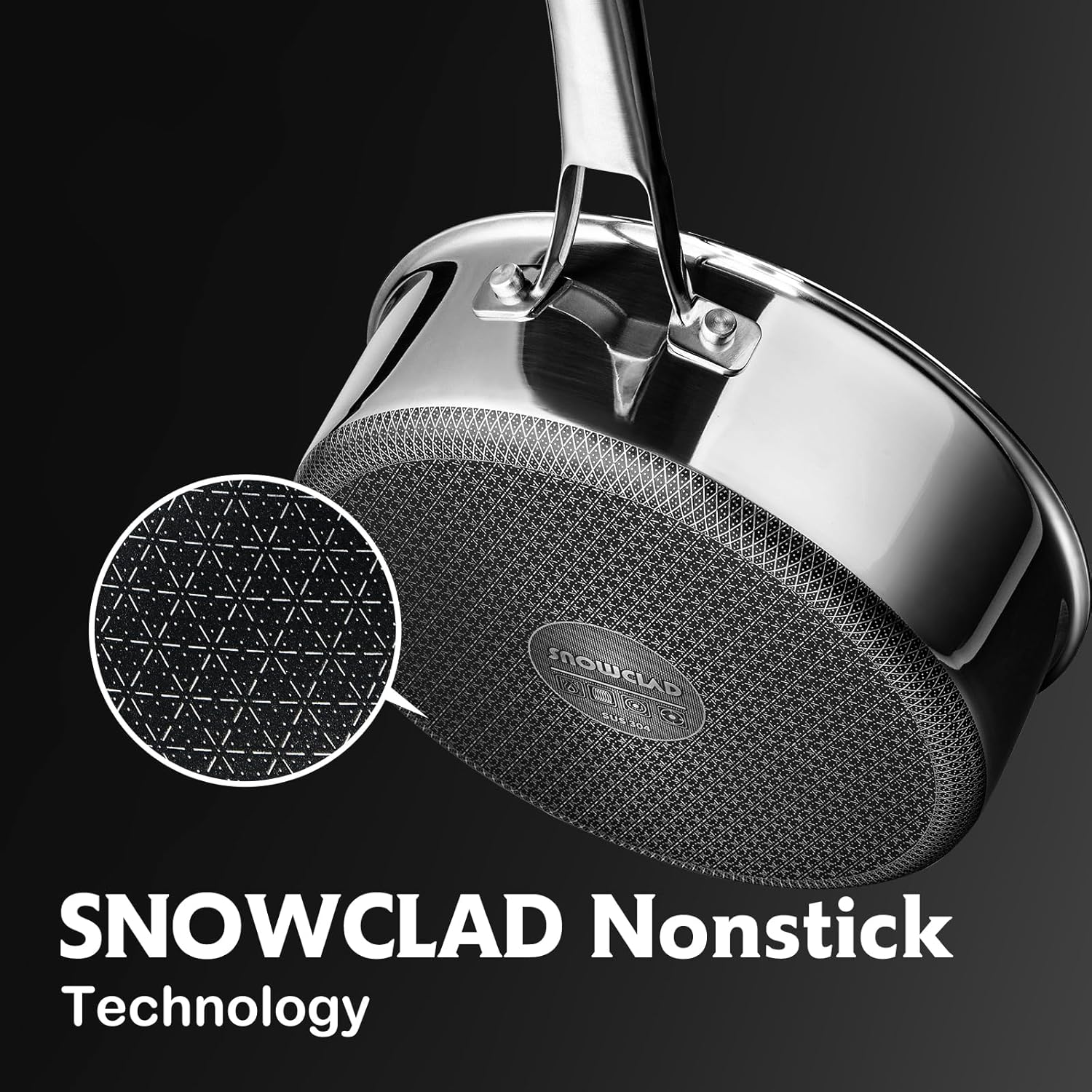 • 【SNOWFLAKE TECHNOLOGY】Our design is created through a laser etching process to provide both stainless steel and non stick surface. This dual surface allows to cook with less oil, grease, and butter.Our clad surface is 50% more than usual Hex surface non stick frying pans.