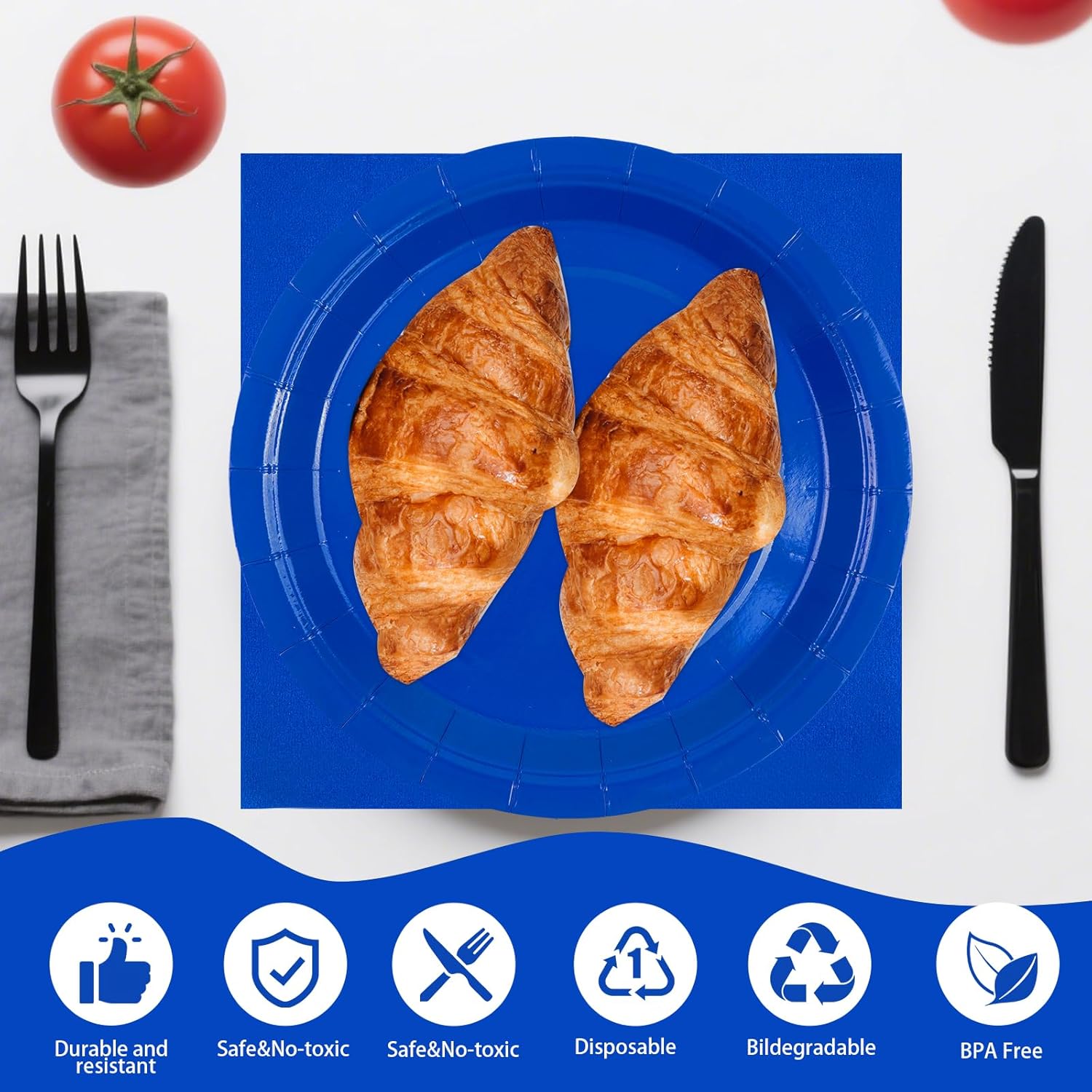 • 【SUPERIOR QUALITY】: Blue party plates made with food grade and high-quality paper materials, strong enough to hold a variety of snacks, salads, and desserts without sagging or tearing, you can confidently serve dishes, and the blue napkins are soft,skin-friendly and absorbent, safe contact with food and skin.