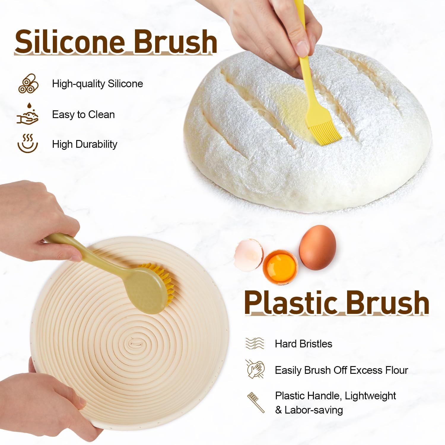 • [What Will You Get] The Sourdough Starter Kit Includes: 1x 9 Inch Round Banneton Basket, 1x 10 Inch Oval Proofing Basket, 2x Linen Liners, 1 × Dough Whisk, 1 × Bread Lame with 5 Blades, 1 × Dough Scraper, 1 × Bowl Scraper, 1 × Silicone Brush, 1 × Cleaning Brush, 1 × Flour Duster, 16 × Baking Stencils, 1 × User Manual. These sourdough bread baking supplies are designed for both beginners and professionals—everything you need to create delicious artisan loaves with ease.