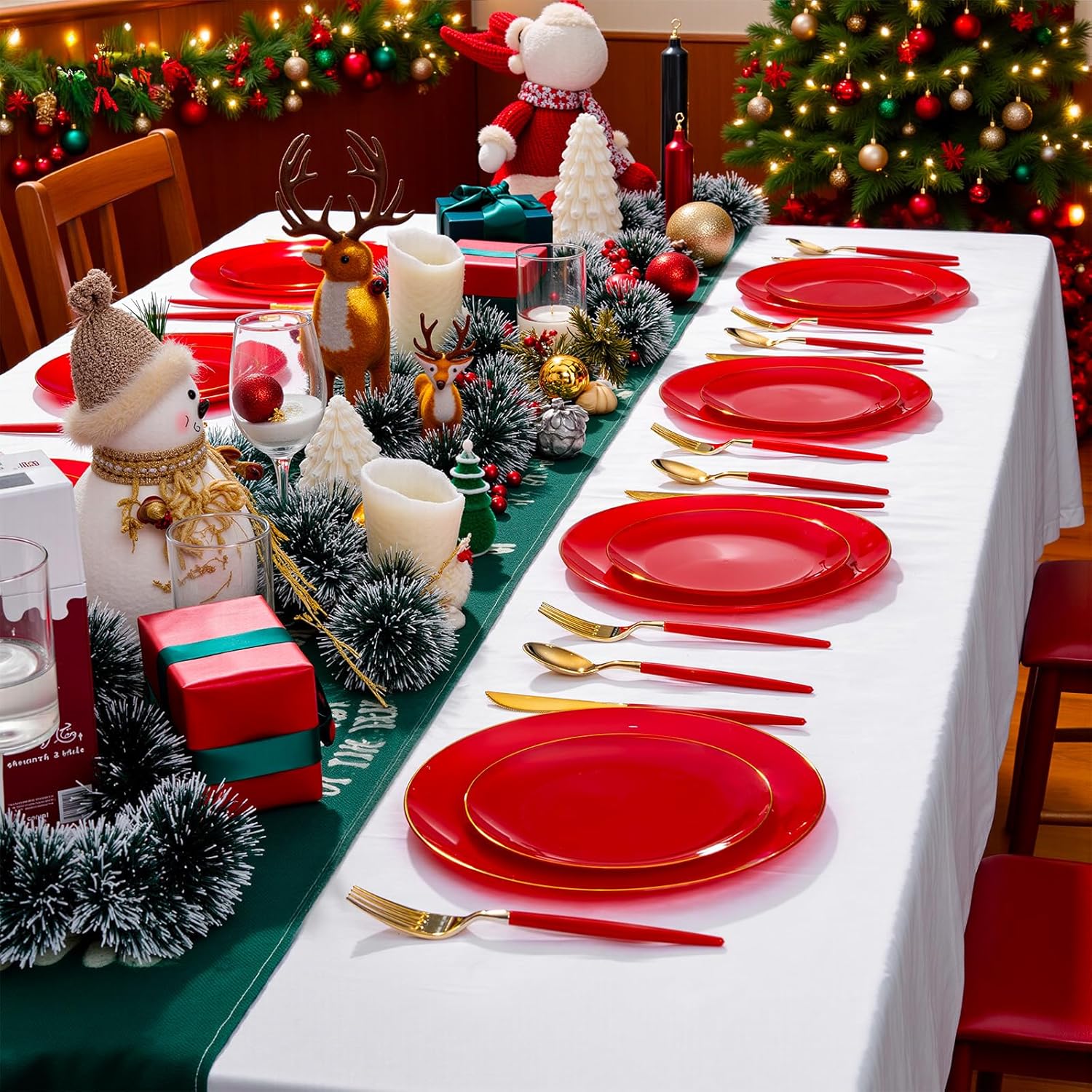 DaYammi 150Pcs Red Plastic Plates & Gold Cutlery with Red Handle,Christmas Disposable Plates Set Include 30 Dinner Plate, 30 Dessert Plate,30 Knives,30 Forks,30 Spoons for Christmas Party Holiday