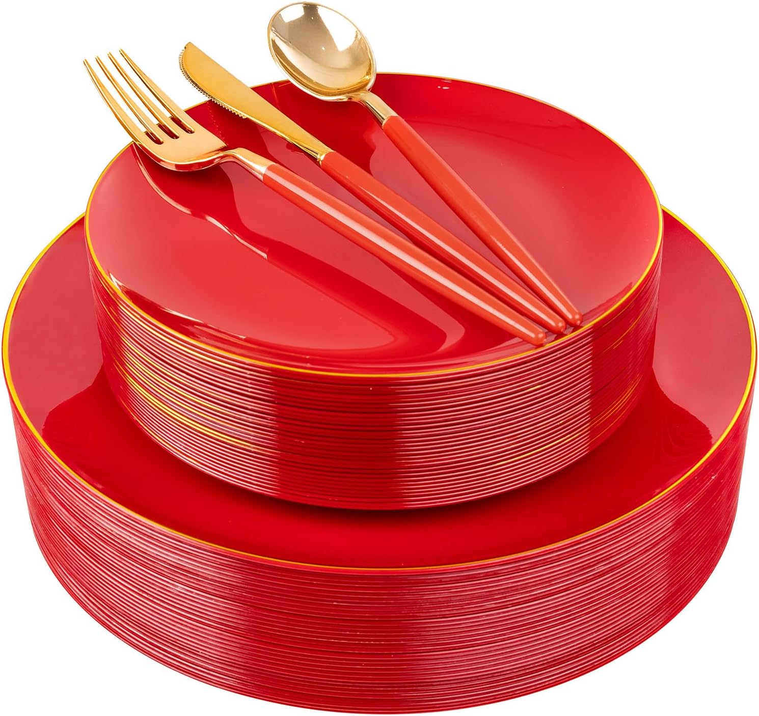 • STYLISH AND ELEGANT: An elegant event needs to be decorated with delicate and fashionable plates. The combination of red and gold, the collision of simplicity and nobility, impressing friends and family with your lavish red plastic disposable plates and silverware.