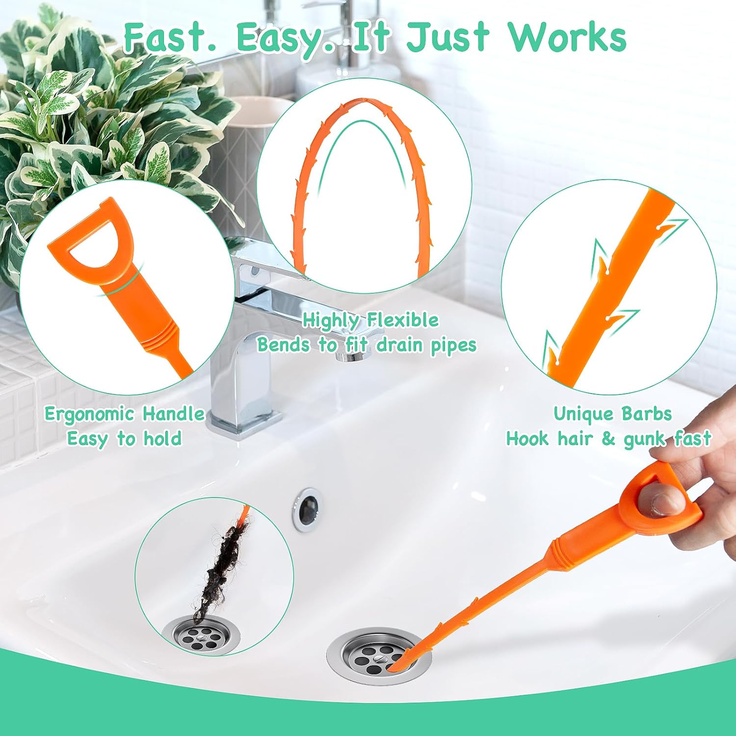 • 【Easy to Use & Cost-Effective】No plumbers, no harsh chemicals—just quick, effective results. This 20PCS drain clog remover tool set is built for easy use. The plastic sink snake grabs hair with barbed tips, while the grabber drain snake claw pulls out clogs and small items with one press. The flexible, ultra-slim steel shafts in the hair clog remover tools slide through bent pipes and narrow spaces to clear hair and debris deep inside your pipes. Fix a clogged drain yourself and cut down on plumbing costs.