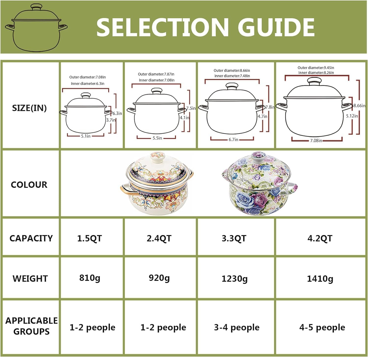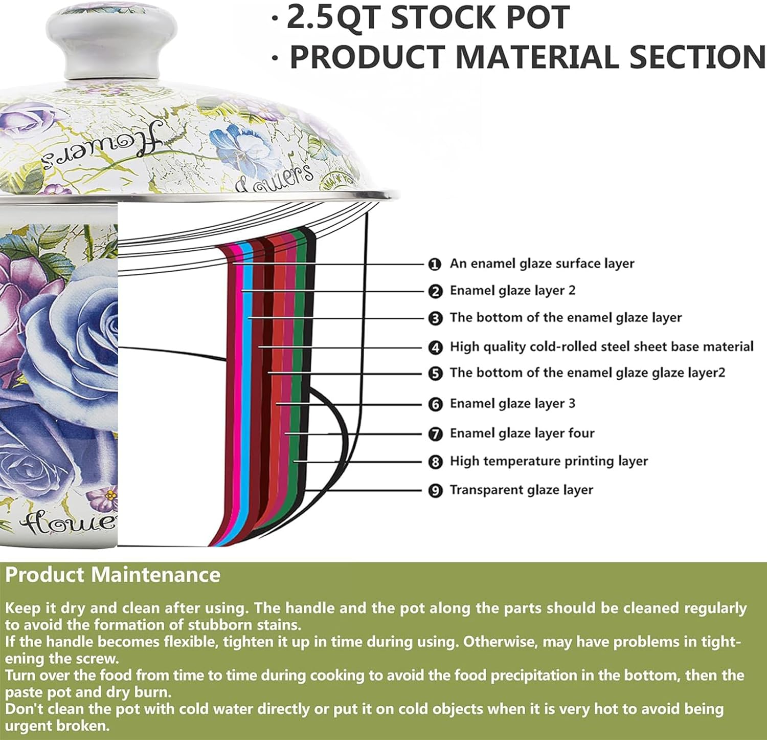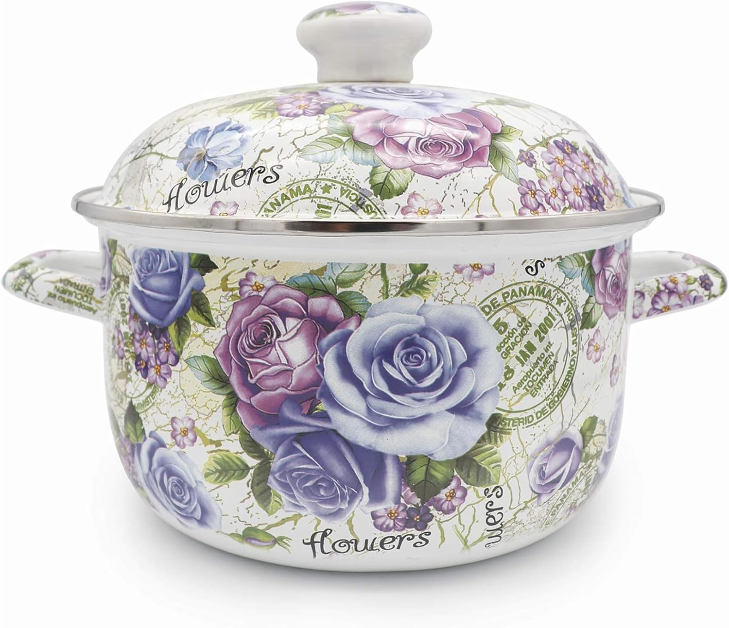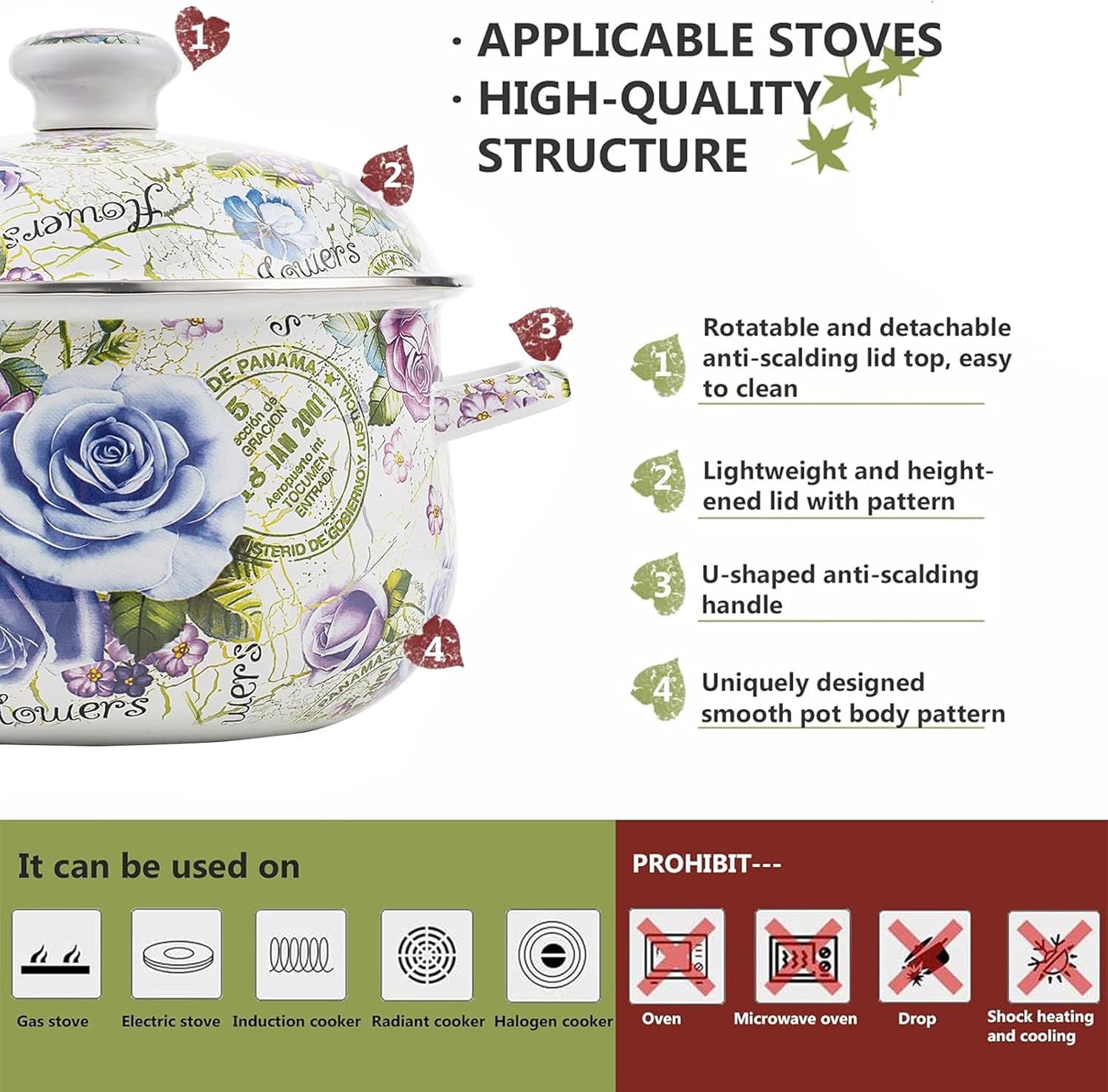 Enamel Stockpot with Lid, 2.5 Quart Retro Cooking Pot, Vintage Floral Stew Bean Simmer Pot with Handle, Kitchen Soup Pot