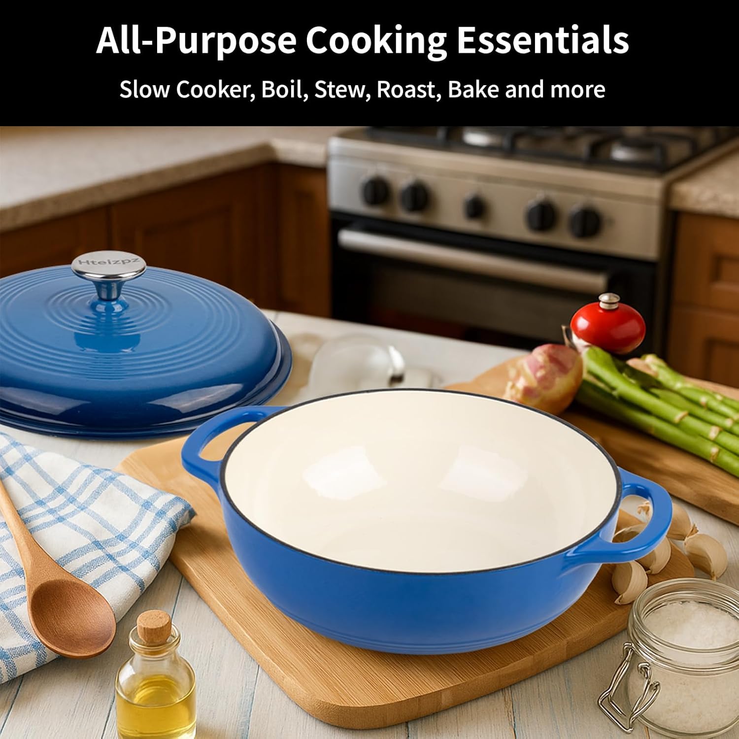Enameled Cast Iron Dutch Oven Pot with Lid, 3 Quart Shallow Dutch Oven, Oven Safe up to 500° F, Suitable for Bread Baking, Braising, Roasting, Stews, Blue