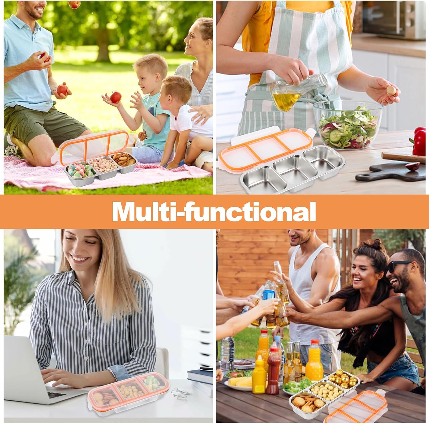 Stainless Steel Snack Containers with Lids, 3 Compartment Leakproof Reusable Snack Box for Nuts, Fruits- Divided Grab & Go Container for School, Office, Travel