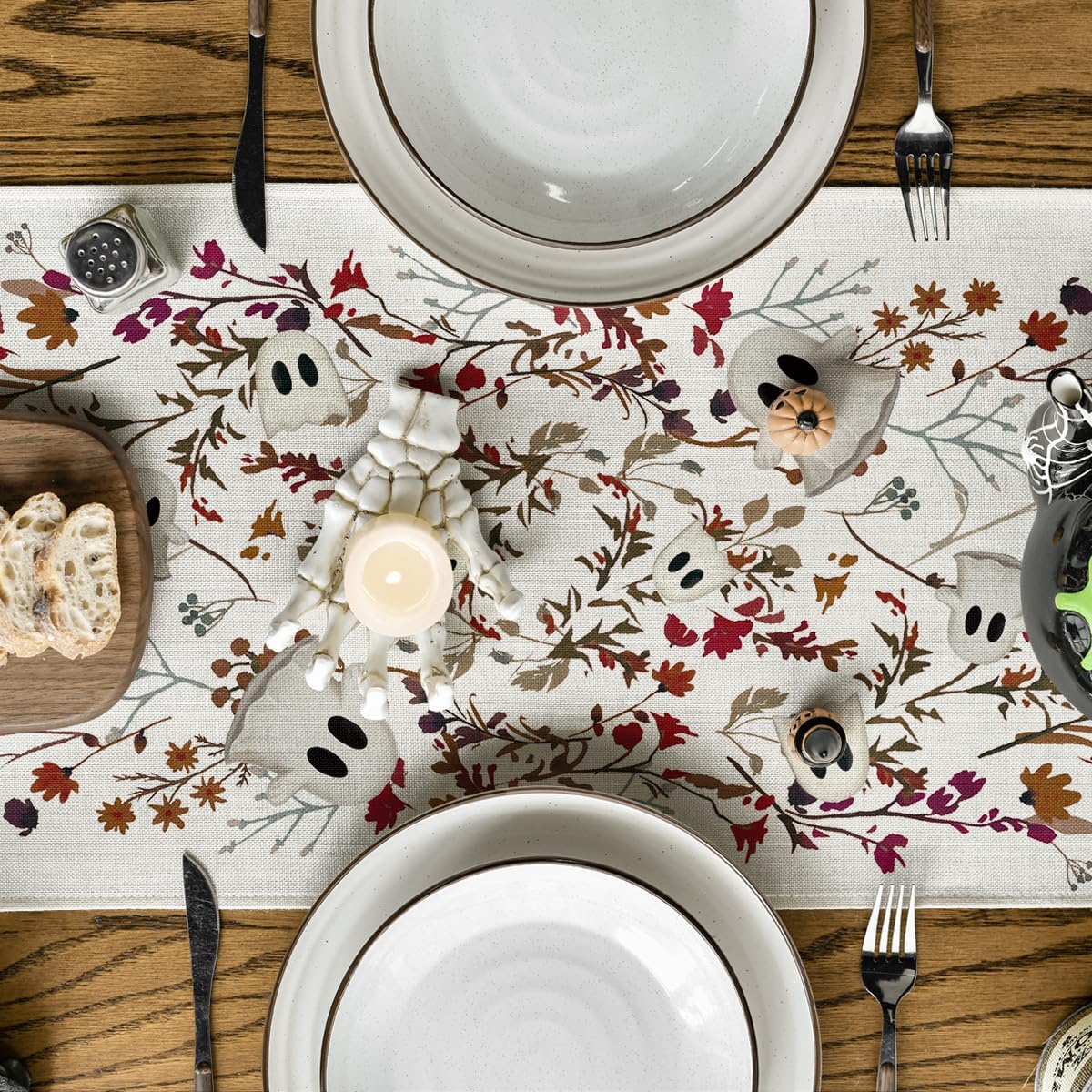 Artoid Mode Ghost Flowers Leaves 210 GSM Halloween Table Runner,Seasonal Fall Kitchen Dining Table Decoration for Home Party Decor 13x120 Inch