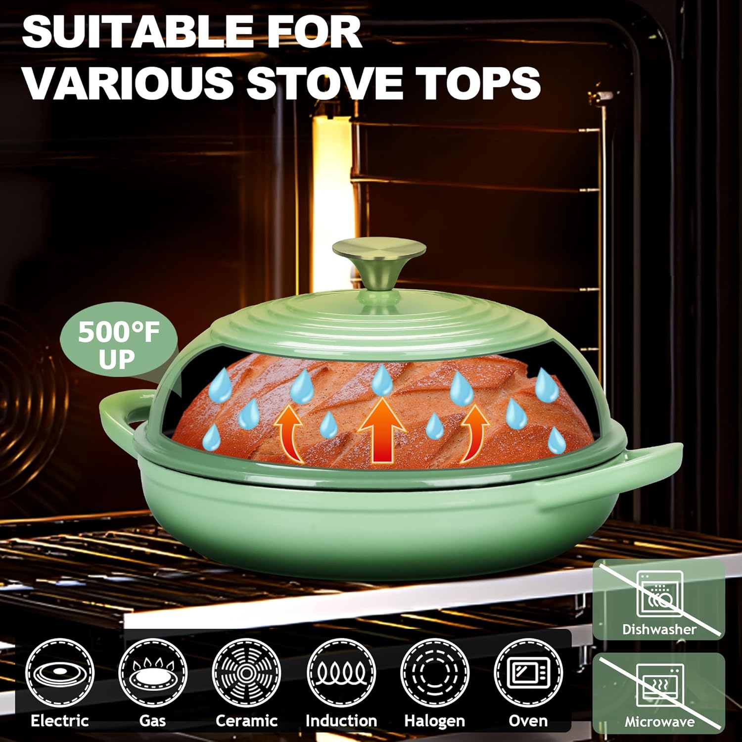 • OPTIMAL HEAT RETENTION & FITS IN VARIOUS STOVES: Thick cast iron core of this dutch oven for bread baking heat evenly the food, Achieves superior cooking results, Provides excellent insulation for keeping food warmer longer, Let you enjoy the delicious meals, Fits for various heat sources: Gas, Induction, Ceramic, Halogen, Electric Stoves and Oven Safe Up to 500°F