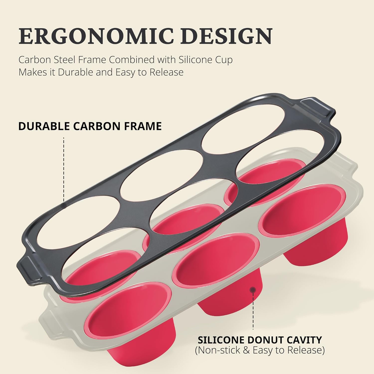 • DURABLE CARBON STEEL FRAME - Our jumbo muffin pan features a robust carbon steel frame, providing superior support and stability. Unlike all-silicone pans, this hybrid design ensures the pan stays strong and maintains its shape, even when handling thick batters. The sturdy carbon steel construction resists warping and bending at high temperatures, offering better control and reliability throughout the baking process.