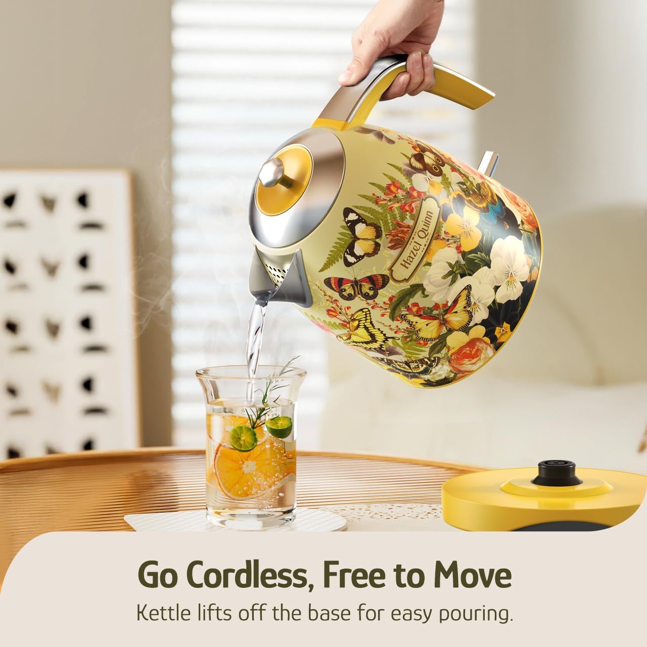 Hazel Quinn X Eduardo Recife Collaboration Electric Kettle - 1.7 Liters (57oz) Stainless Steel Water Kettle, BPA-Free Interior, 1200W Fast Boiling, Cordless, Automatic Shut Off - Floral Printed