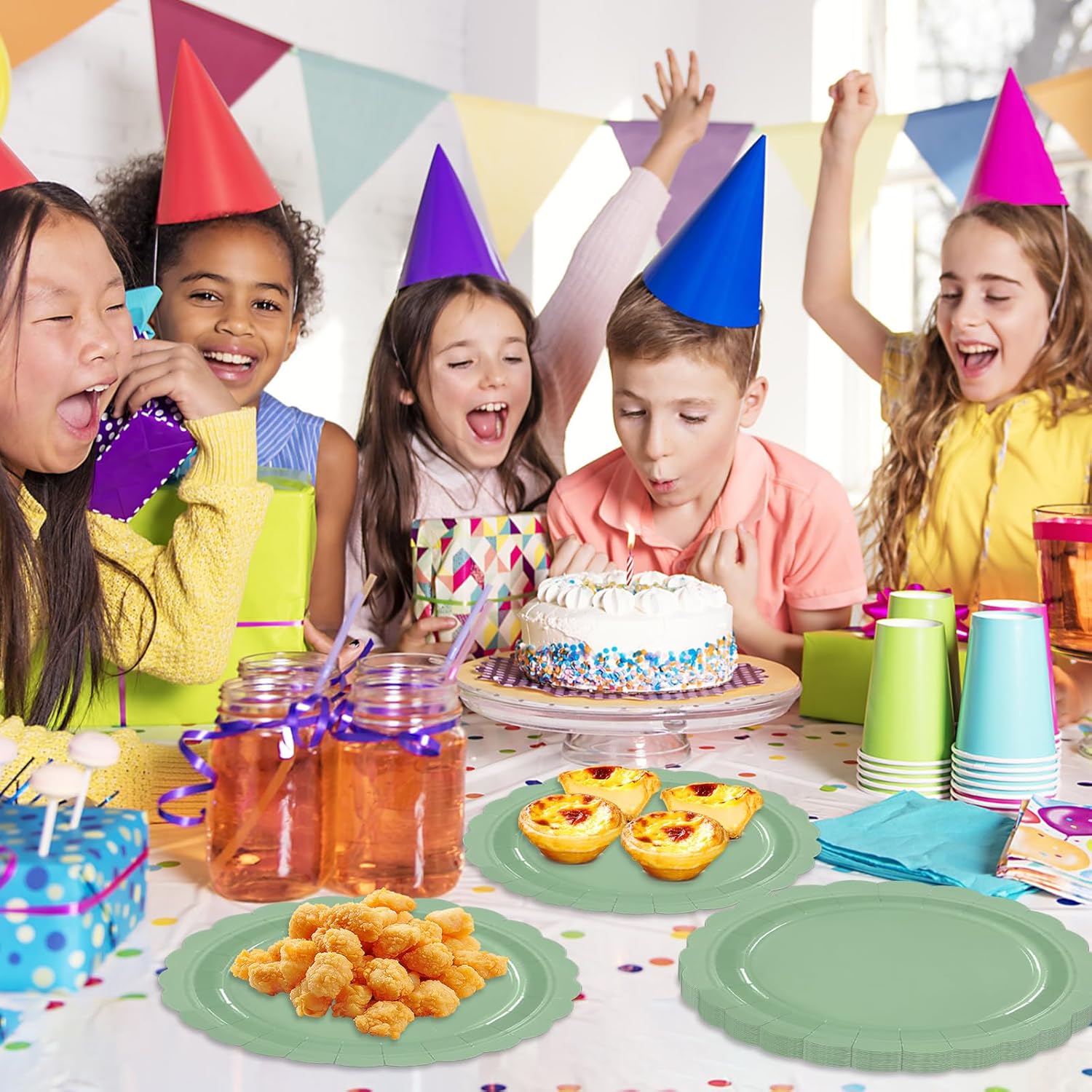 • Sage Green scalloped plates: The edges of the disposable paper plates are designed with Vintage Floral pattern makes the whole set look elegant and beautiful. Enjoy your sweet party.
