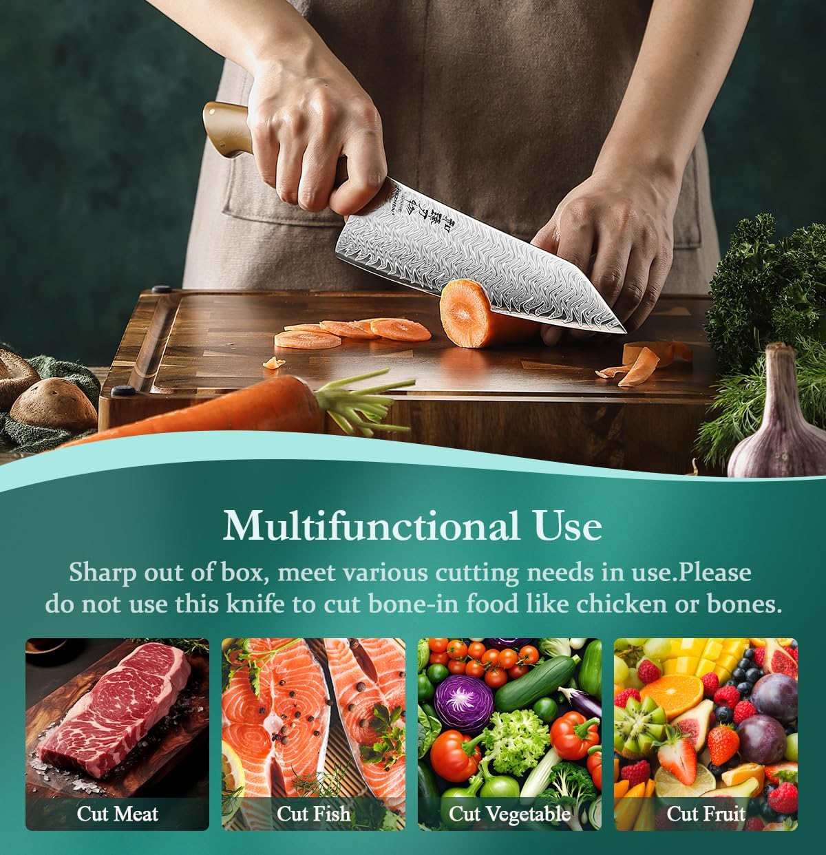 • [Premium Sharp Damascus Steel Blade] Made of hand-forged 67 Layers Damascus Steel with precision to deliver unmatched edge retention, corrosion resistance, and flexibility; The intricate wavy pattern not only enhances its visual elegance but also reinforces structural integrity, reducing friction for smoother, more precise cuts