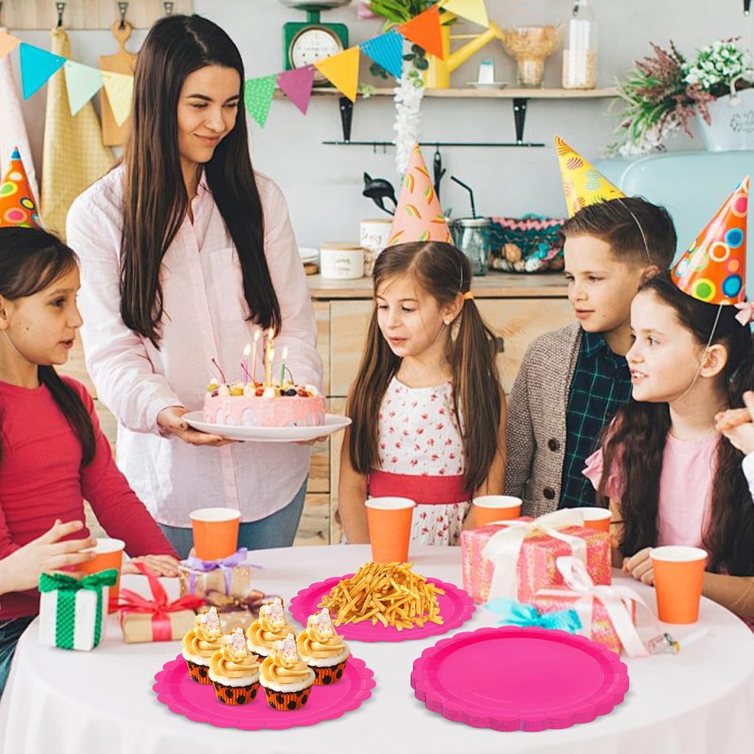 • Hot pink scalloped plates: The edges of the disposable paper plates are designed with Vintage Floral pattern makes the whole set look elegant and beautiful. Enjoy your sweet party.