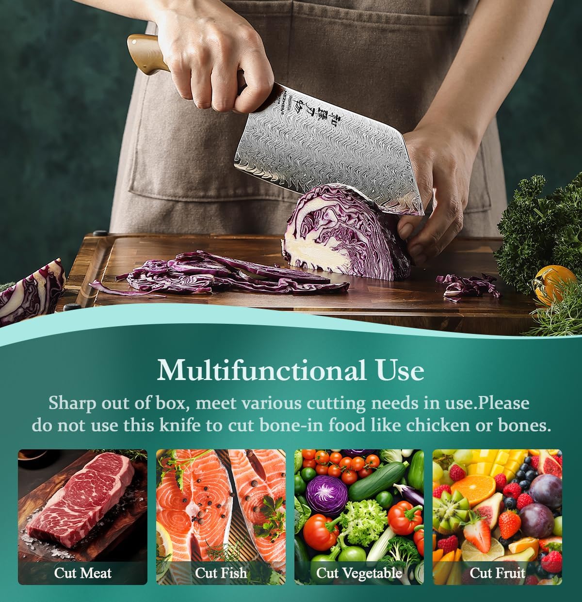 • [Ultra-Sharp Blade] Expertly honed to a razor-sharp 15° angle per side for effortless slicing, dicing, and chopping; The finely balanced edge and 62 HRC hardness ensures long-lasting sharpness while maintaining durability and resistance to chipping—perfect for both left- and right-handed users