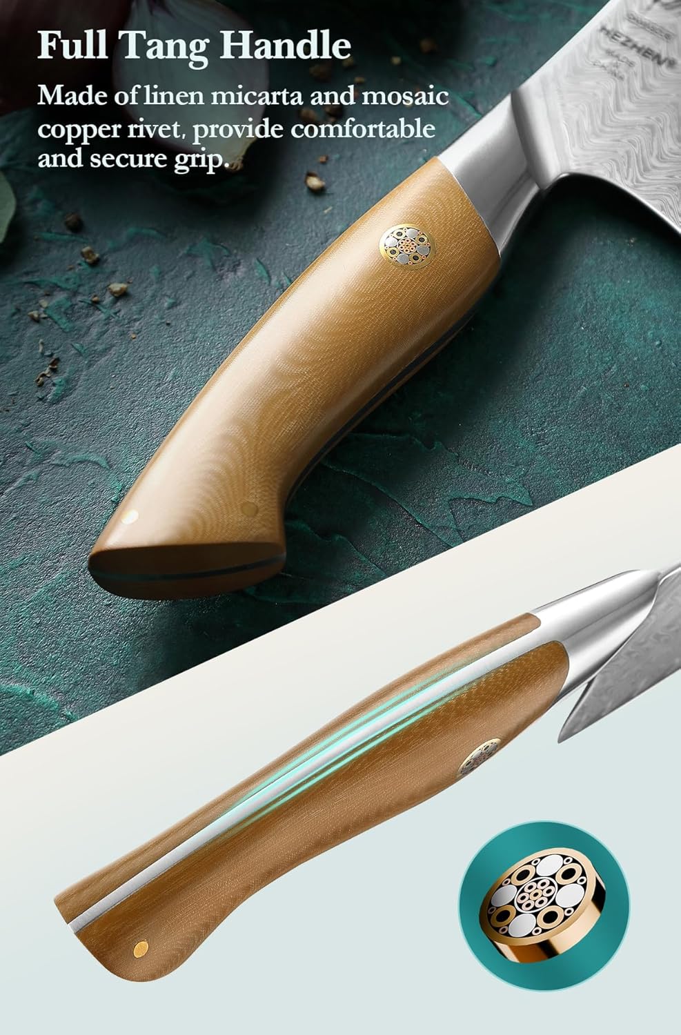 • [Ergonomic Linen Micarta Handle] Crafted from ultra-durable resin-infused fabric for superior abrasion resistance and effortless maintenance. Designed for all-day comfort, its full-tang construction with reinforced copper rivets ensures unmatched stability and strength—trusted by chefs and outdoor enthusiasts alike