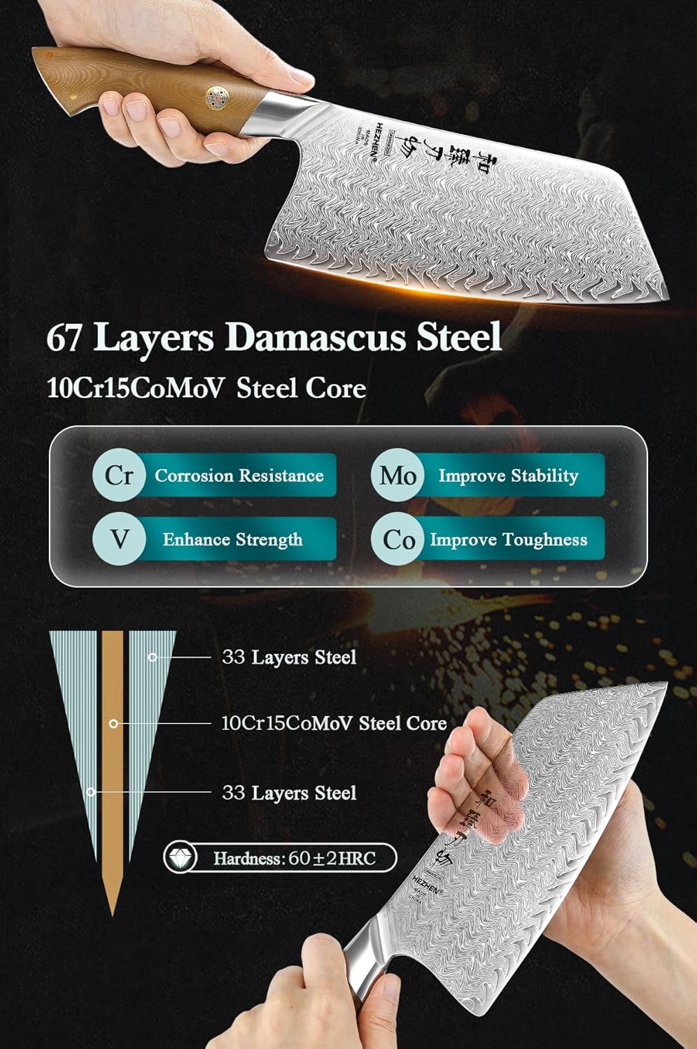 HEZHEN Damascus Meat Cleaver Knife, 7.5 Inches, 67 Layers Damascus Steel Vegetable Cleaver, Professional Butcher Knife for Meat Cutting, Ultra-sharp Blade with Linen Micarta Handle, Gift Packing
