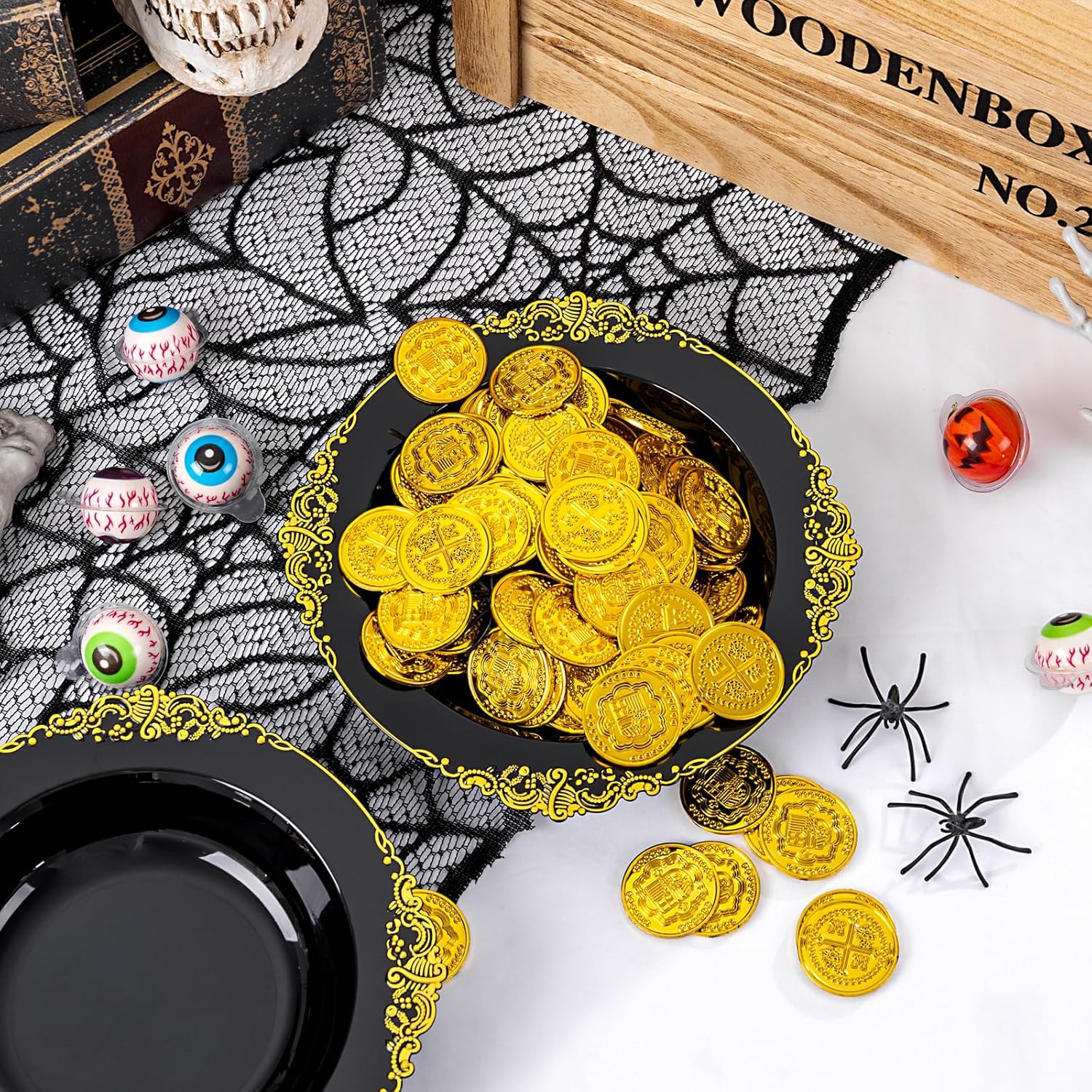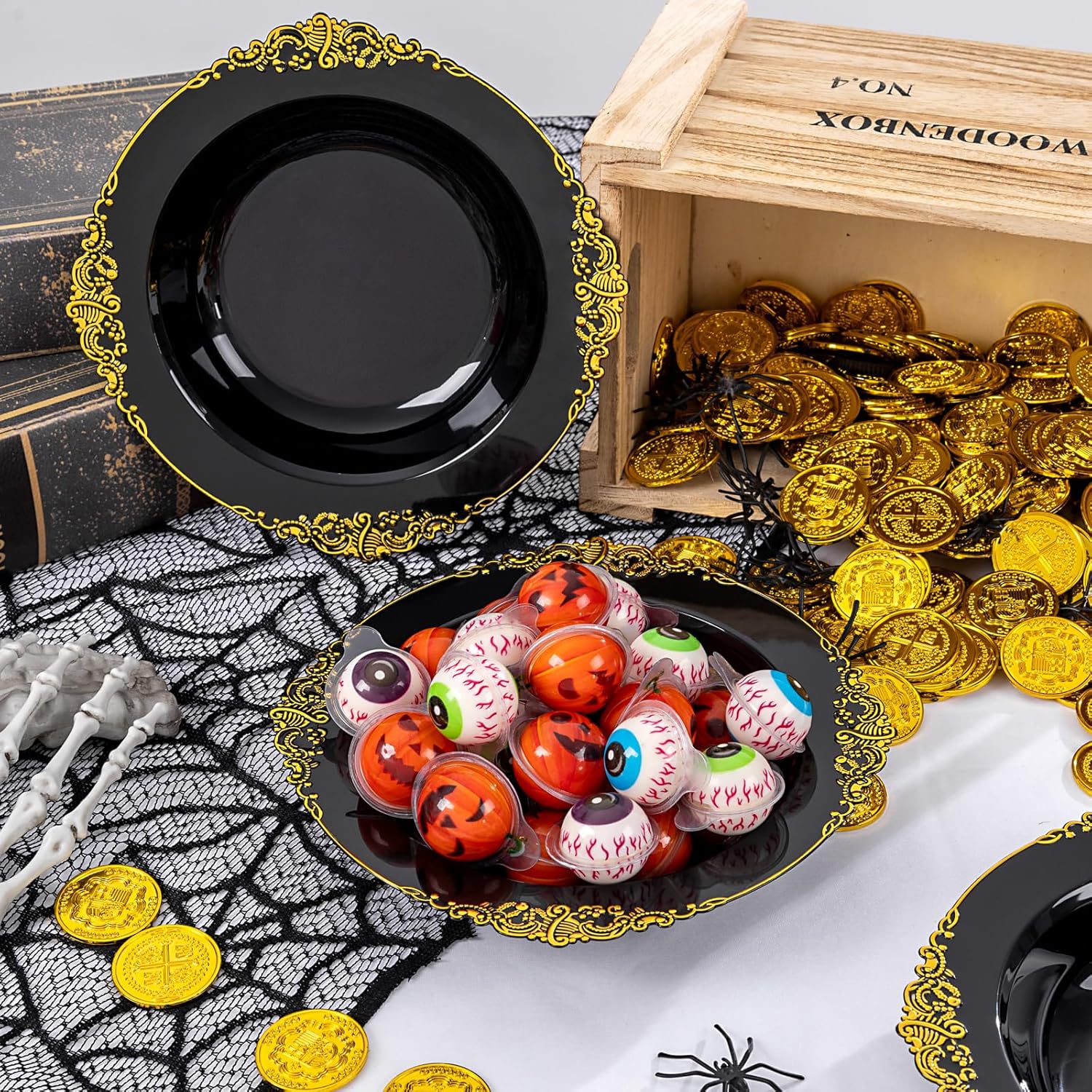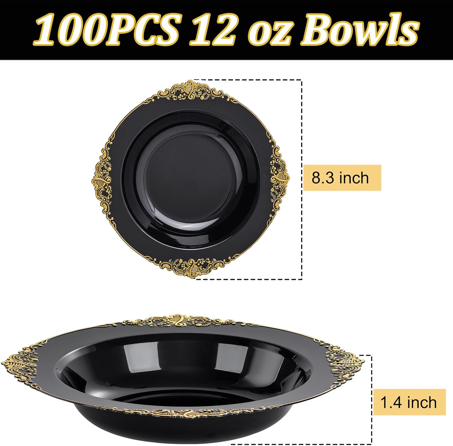 100PCS Black Plastic Bowls - 12 oz Black Gold Disposable Salad Bowls - Heavy Duty Soup Serving Bowl - Fancy Plastic Candy Bowl for Weddings, Parties, Dinners, Catering, Picnics, Halloween Party