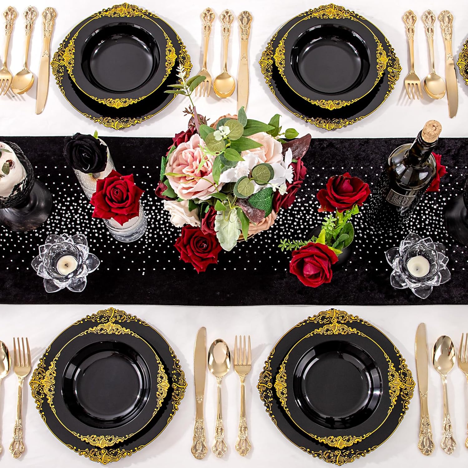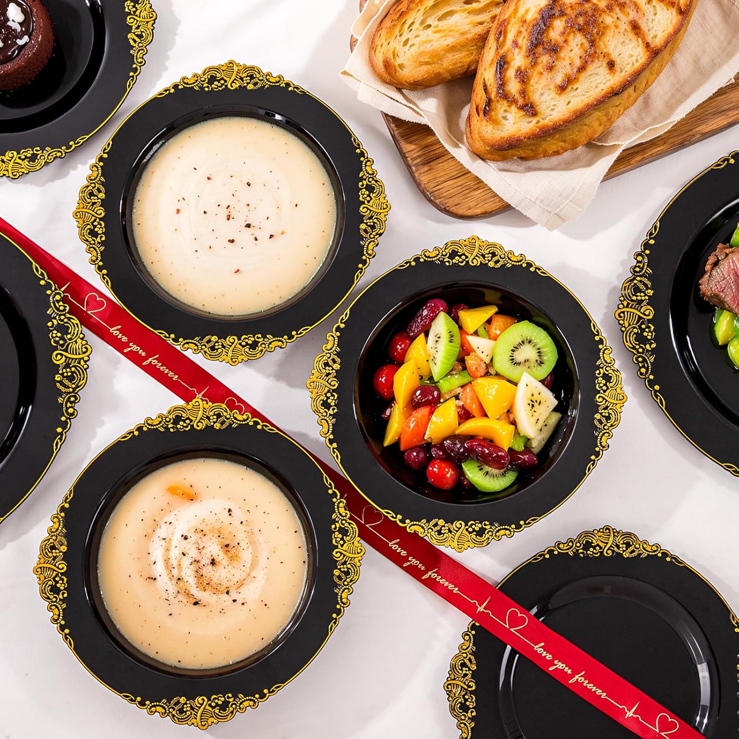 • Elegant Design: The black plastic bowls features a sparkling gold rim, creating a classic look. These black plastic bowls are perfect for adding a touch of grace and elegance to any event, from weddings to cocktail parties.