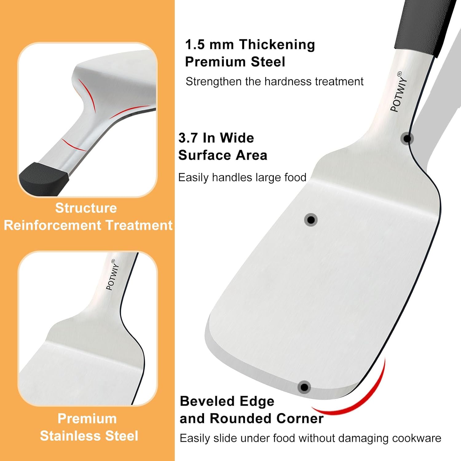 • Heavy Duty Stainless Steel Structure: The spatula set uses a 1.5mm thick high-quality stainless steel core. The full tang one-piece structure with reinforced treatment is more sturdy and can perfectly bear the weight without deformation