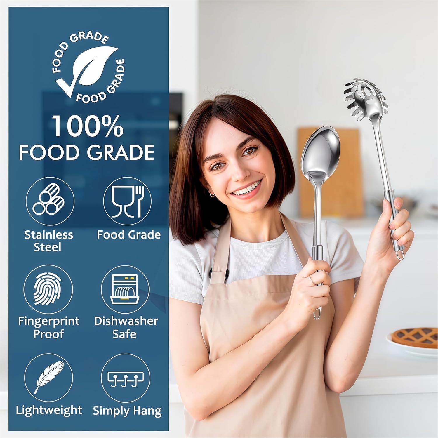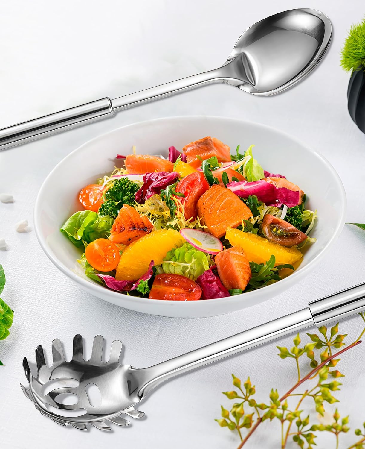 • 👨‍🍳【2 Pack Stainless Steel Cooking Spoon Set】Our large Pasta Fork Spoon Set is a economic set for cooking and baking noodle. This Long cooking spoon set comes with 1pcs Serving Spoon and 1pcs Pasta Fork. It's the perfect combination for Spaghetti.