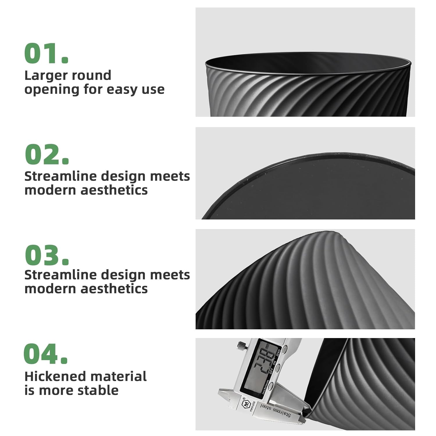 • 💪【Sturdy & Multipurpose】 Built to last with impact-resistant plastic and a raised anti-slip base to reduce wear. Beyond trash, use them as storage bins for toys, laundry, or cleaning supplies—or even as a mini flower pot! Effortlessly wipes clean for hygiene.