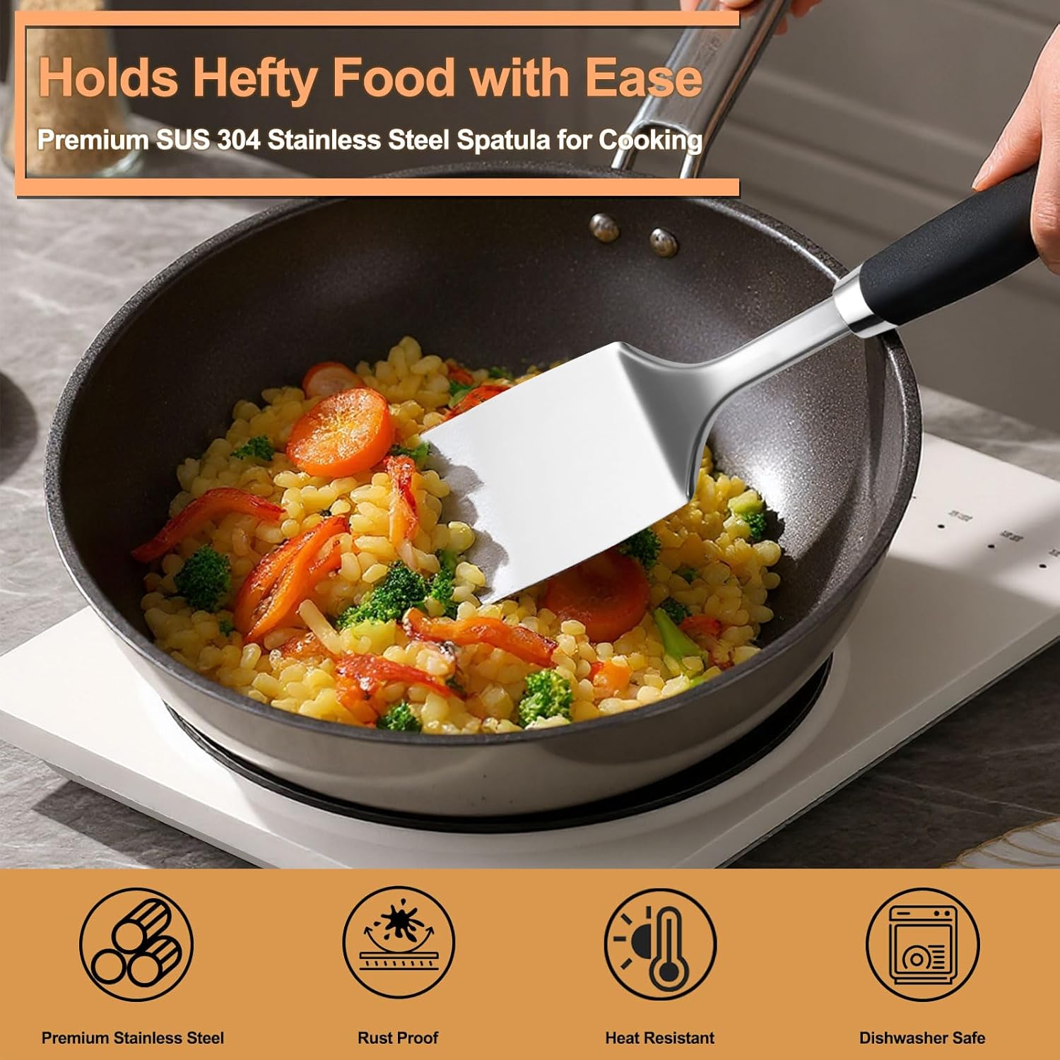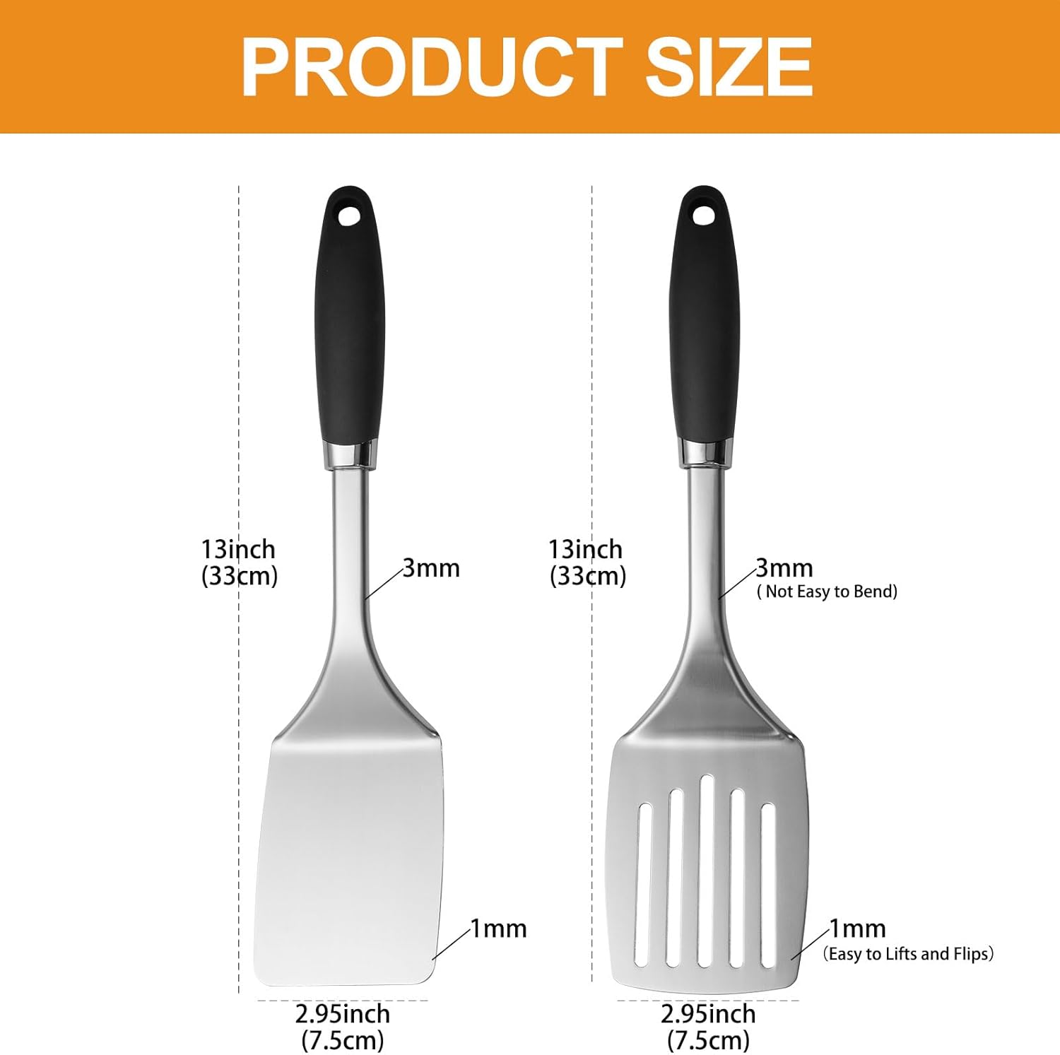 • Premium Material: The high-quality spatula turners are made of SUS 304 stainless steel with sturdy, antirust, durable, which is keeps you away from the trouble of kitchen utensils rusting or breaking.