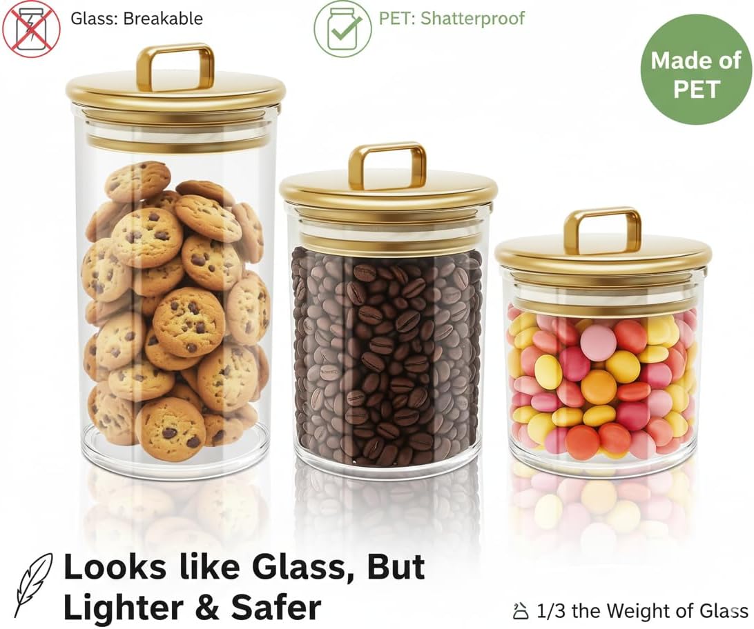• Add a stylish touch to any space with this 3-pack clear PET jar set featuring gold airtight lids. These jars are ideal for decorative candy jars, gold apothecary jars, or bathroom vanity containers for storing cotton pads, bath bombs, or small toiletries. The elegant design and gold accents make them a perfect addition to any gold home décor collection, whether placed on countertops, vanities, or shelves. They also make for a perfect gift for those who love mid-century modern bathroom accessories or chic vanity accessories.