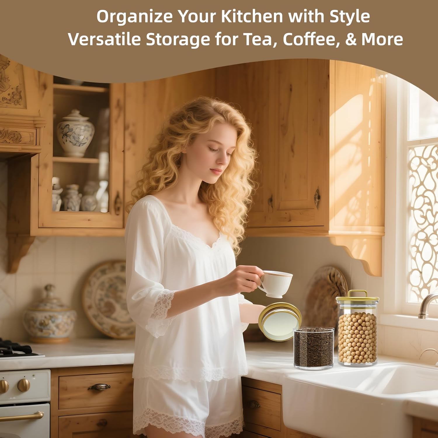 • Each jar is equipped with a secure gold airtight lid that locks in freshness and protects contents from moisture and dust. Perfect for storing bath bombs, cotton swabs, or even coffee beans, the gold lids help preserve the freshness and security of your items, making these jars an essential addition to your gold bathroom accents or gold room accents.