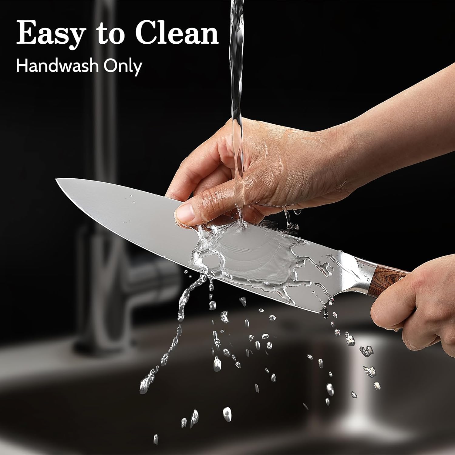 • 【Well-Balanced Kitchen Knife Set】The blades and handles of this set are perfectly balanced, allowing you to easily tackle everyday kitchen tasks like chopping, slicing, and dicing. The ergonomic wooden handle provides superior comfort, helping to minimize fatigue, numbness, or pain during use.