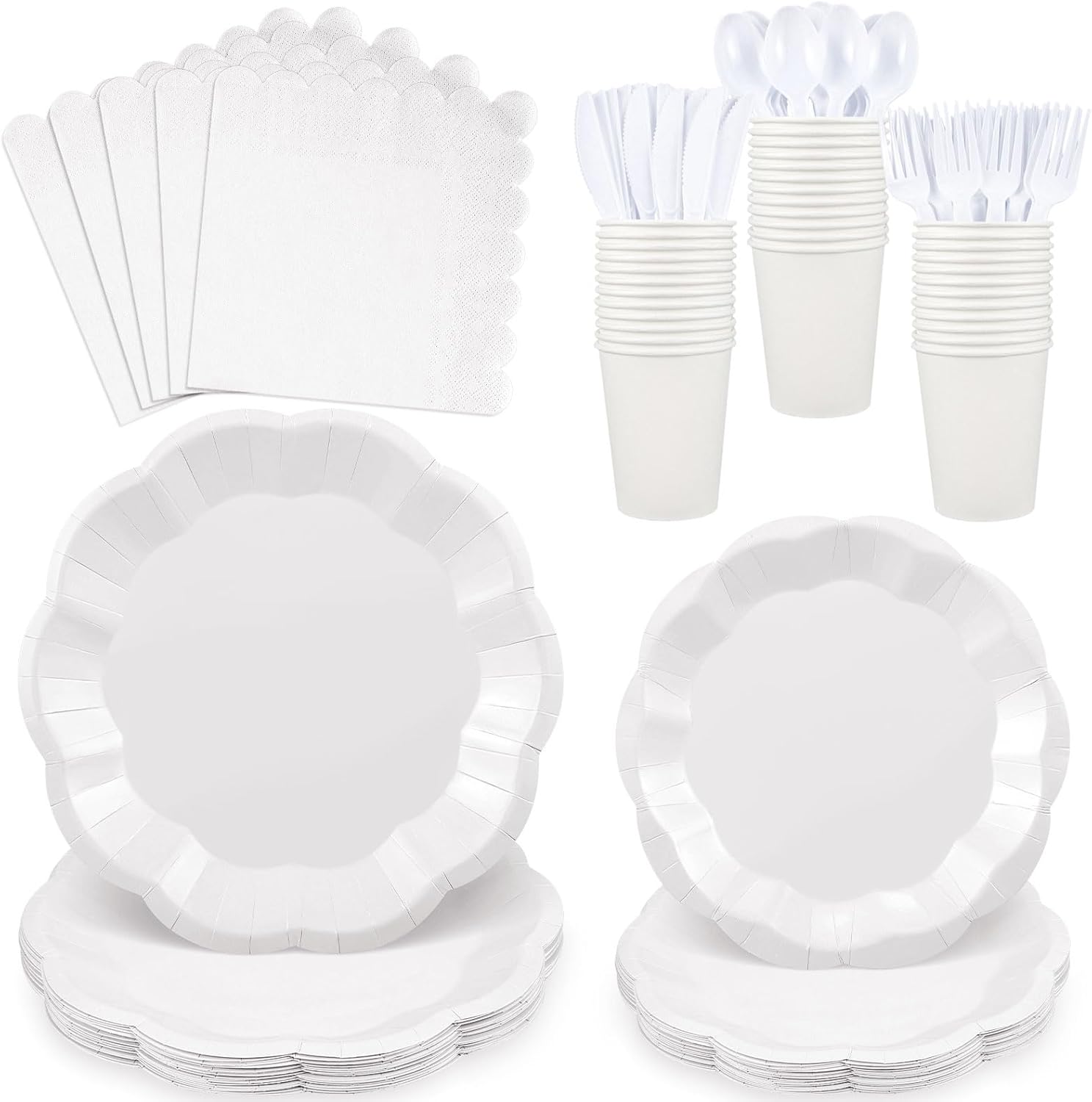 175 Pcs White Plates and Napkins Set, 25 Guest White Party Supplies Include Scalloped Plate Paper Napkin Cup Forks Knives Disposable Plastic Cutlery for Wedding Baby Shower Birthday Party