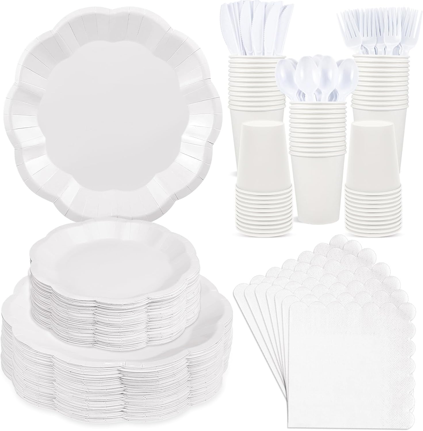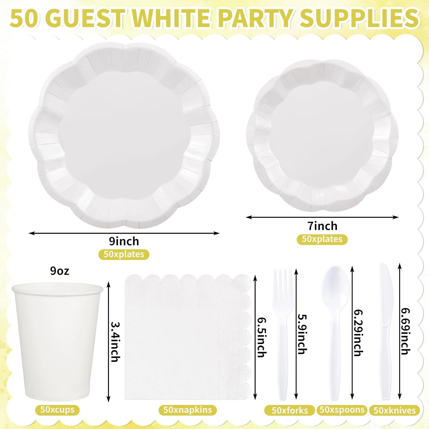 350 Pcs White Party Supplies Include Scalloped Plate Napkin Cup Forks Knives, Plastic Cutlery 50 Guest Disposable Parties Tableware Set for Wedding Baby Shower Bridal Shower Birthday Party