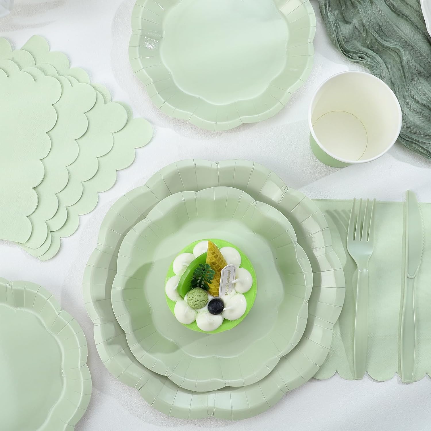 350 Pcs Sage Green Party Supplies Include Scalloped Plate Napkin Cup Forks Knives, Plastic Cutlery 50 Guest Disposable Party Tableware Set for Wedding Baby Shower Bridal Shower Birthday Parties
