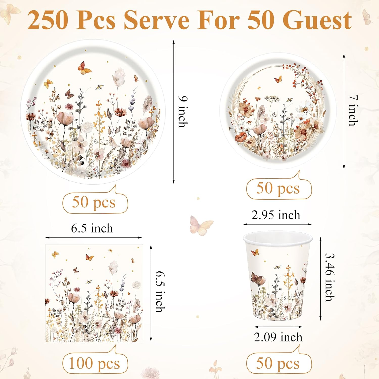 250 Pcs Wildflower Party Decorations Include Boho Autumn Fall Floral Paper Plates Napkins and Cups for Wildflower Baby Shower Tea Decorations, Serve 50 Guest