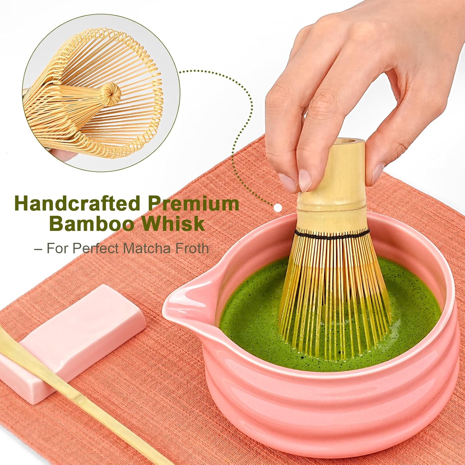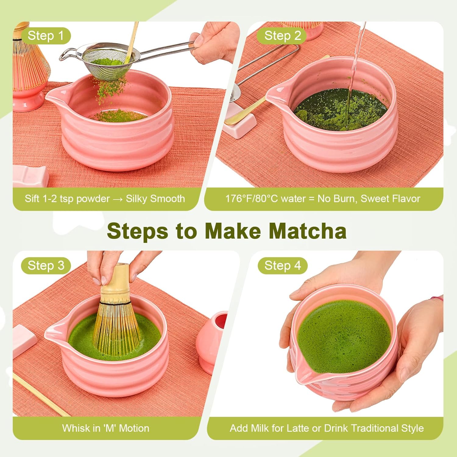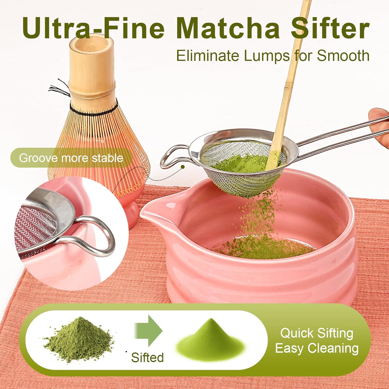 Matcha Whisk Set, 7Pcs Matcha Set - Matcha Bowl with Spout, Handcrafted Bamboo Whisk Chasen & Ceramic Holder, Steel Sifter, Towel, Matcha Kit for Tea Lovers, Timeless Ideal Gift (Pink)