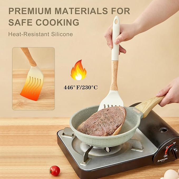 • 【Reliable Food-Grade Silicone Performance】 The durable silicone components maintain flexibility through repeated use, resisting deformation better than plastic alternatives. Heat Resistant to 446°F/230°C, suitable for various cooking techniques from sautéing to baking. Before using the silicone kitchen utensils for the first time , the original smell will disappear after washing the kitchen utensils in water and exposing it to air for about 3 hours.