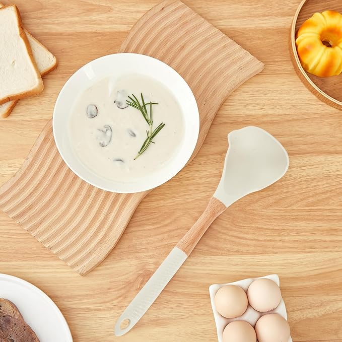 Kitchen Utensils Set - 7 PCS Non-Stick Silicone Cooking Utensils Set with Wooden Handle,Kitchen Gadgets Tools Set for Nonstick Cookware (Cream White-7Max)