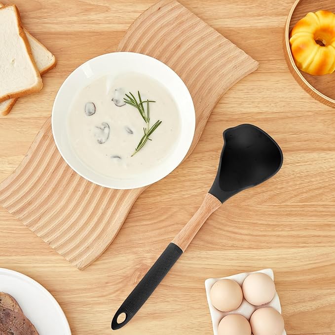 Kitchen Utensils Set - 7 PCS Non-Stick Silicone Cooking Utensils Set with Wooden Handle,Kitchen Gadgets Tools Set for Nonstick Cookware (Black-7Max)