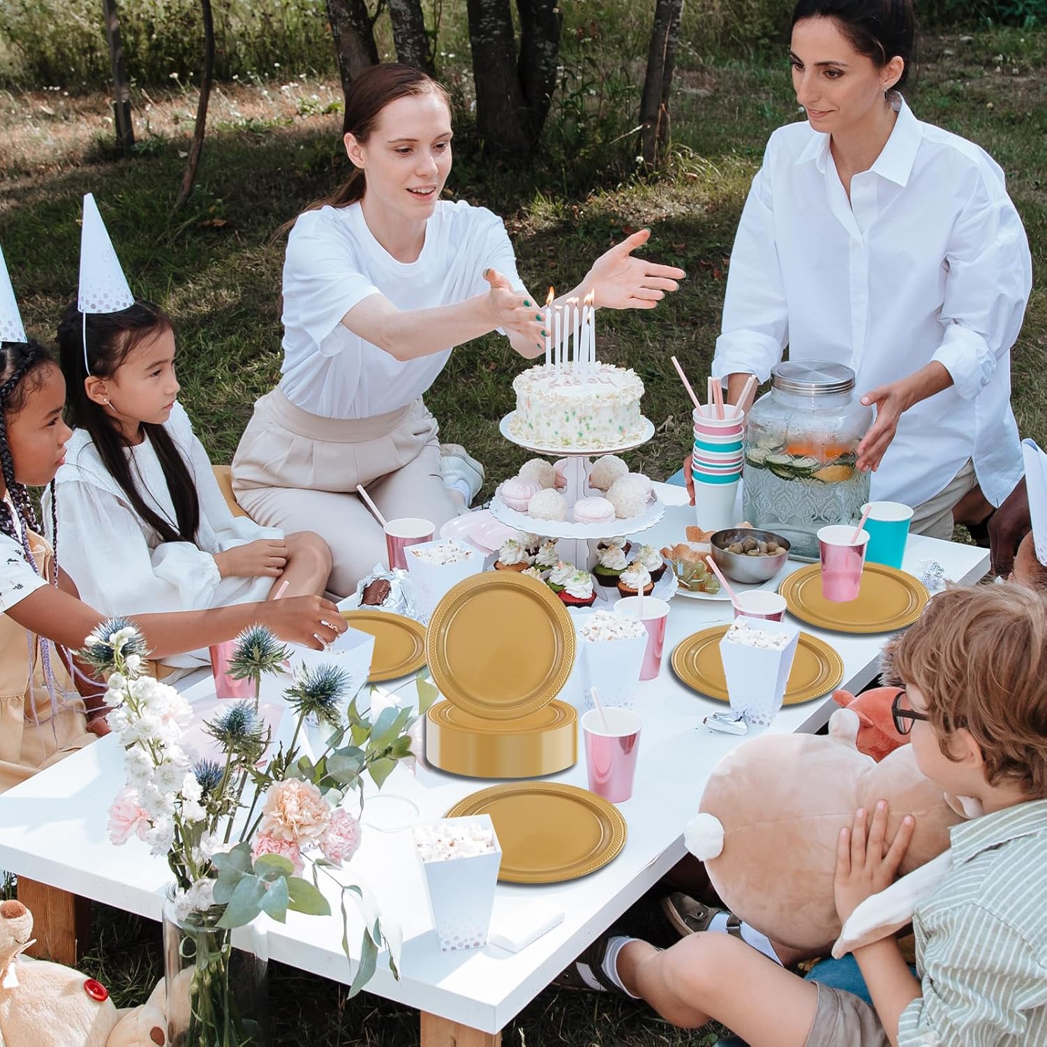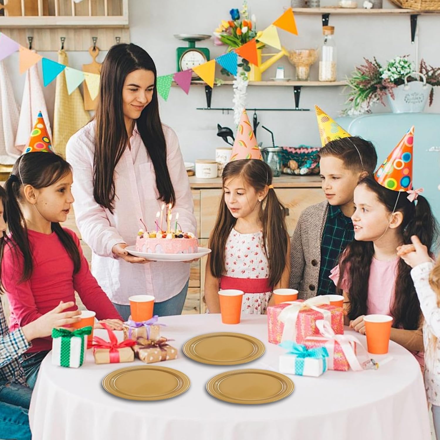 • Perfect 7-Inch Versatile Size: The ideal size for a multitude of uses. Use them as elegant dessert gold plates, cake plates for birthday parties, or gold appetizer plates for catering. Their smaller size makes them perfect for buffets and dessert tables.