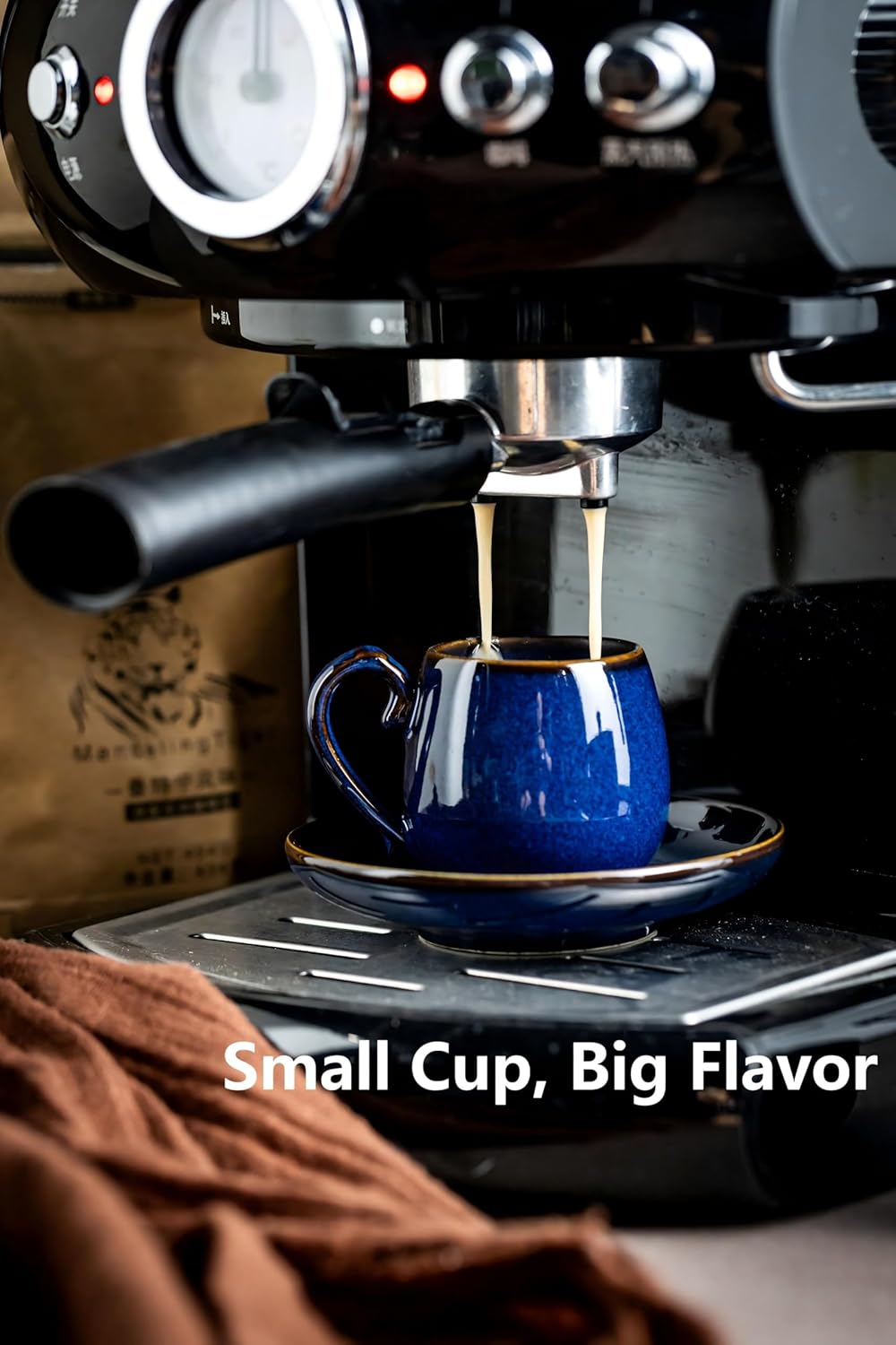• Cute 3oz Espresso Set with a Pop of Color: Features 6 ceramic cobalt blue cups (3oz), round saucers, 6 spoons, and a sleek metal stand—ideal for espresso shots, mini mochas, or tea. The vibrant blue adds a fun, modern twist to your coffee routine