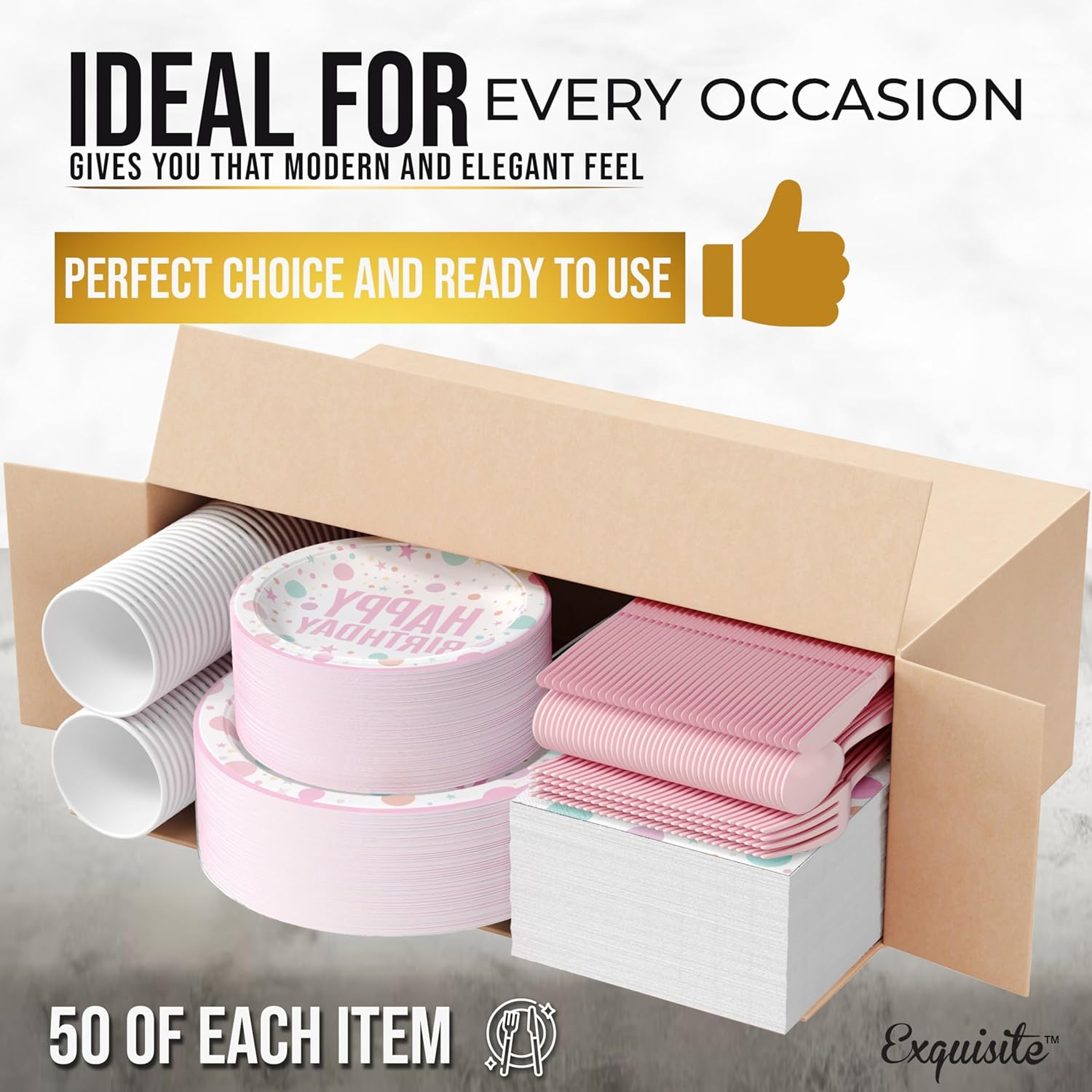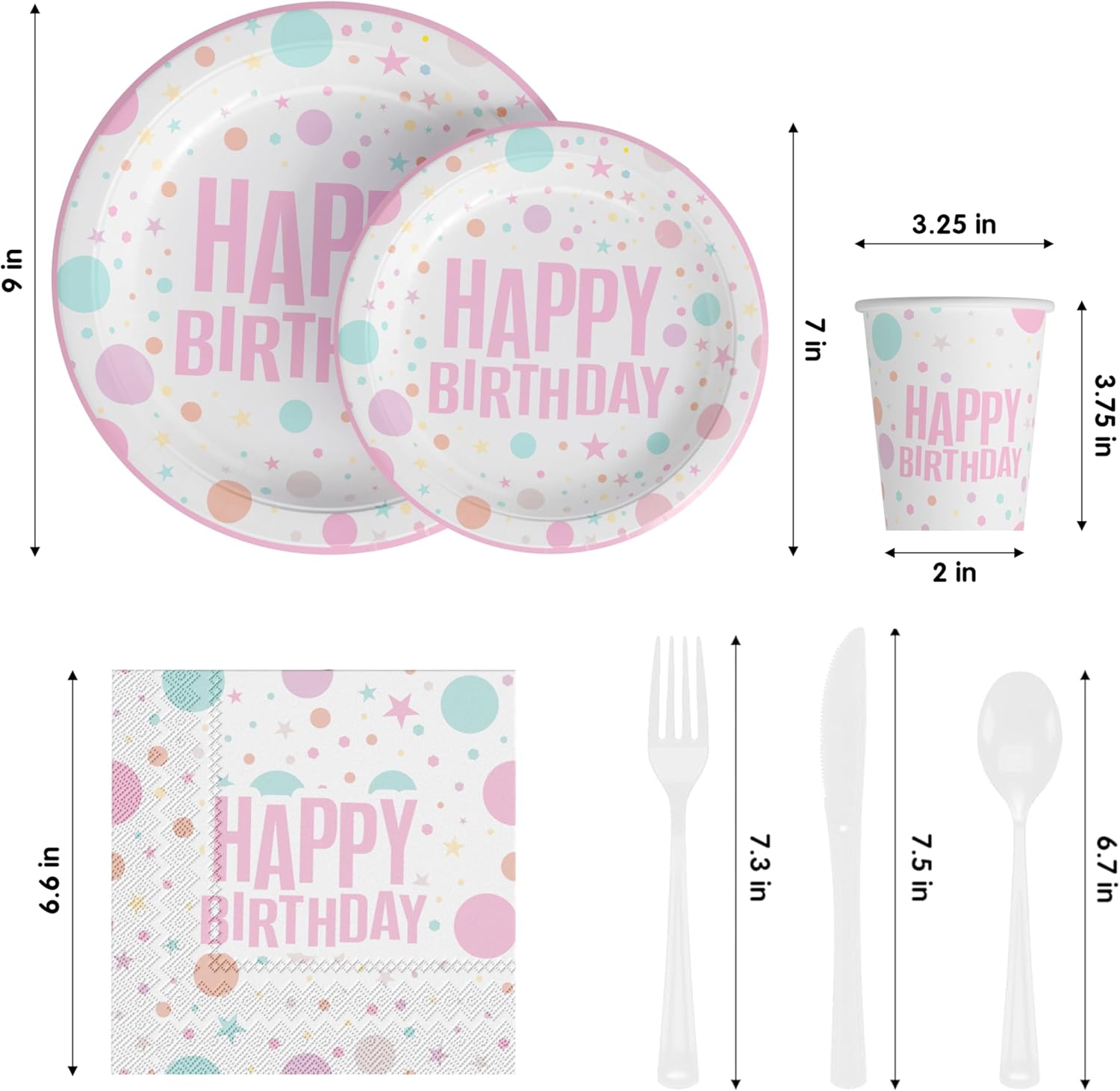 • Includes: This pink birthday party plates and cups and napkins set includes 50 9" pink birthday plates disposable, 50 7" birthday appetizer plates disposable, 50 12 oz birthday paper cups, 50 13" pink birthday napkins, and 50 each of 7.5" birthday plastic spoons, forks, and knives. Made from strong materials, this paper dinnerware set disposable is sure to hold up well for all your needs.