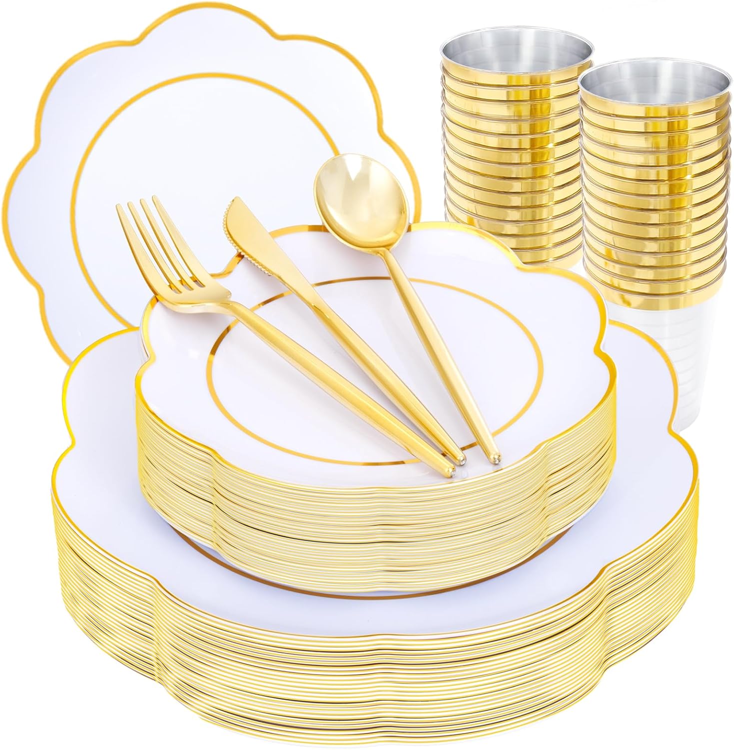 • ejonirinjonir EI 180pcs White Plastic Plates with Gold Plastic Silverware,Heavy-Duty Disposable Plates for Party,White Dinnerware Set for 30 Guest Wedding,Birthday