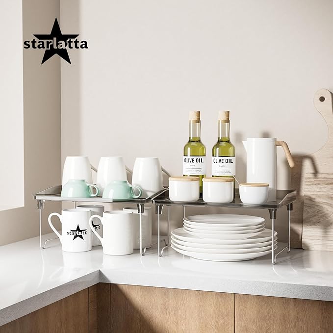 • 【Foldable & Stackable】Foldable to save space and easy to use, this cabinet organizer shelf is stackable with double shelves to create more storage space