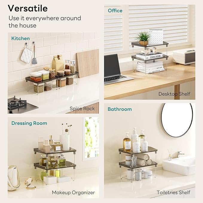 2 Pcs Cabinet Organizer Shelf,Stackable Kitchen Counter Shelves, Spice Rack,Countertop Organizers,Black Plastic Storage Shelves Rack for Makeup,Bathroom, Cupboard,Desk,Pantry Organization