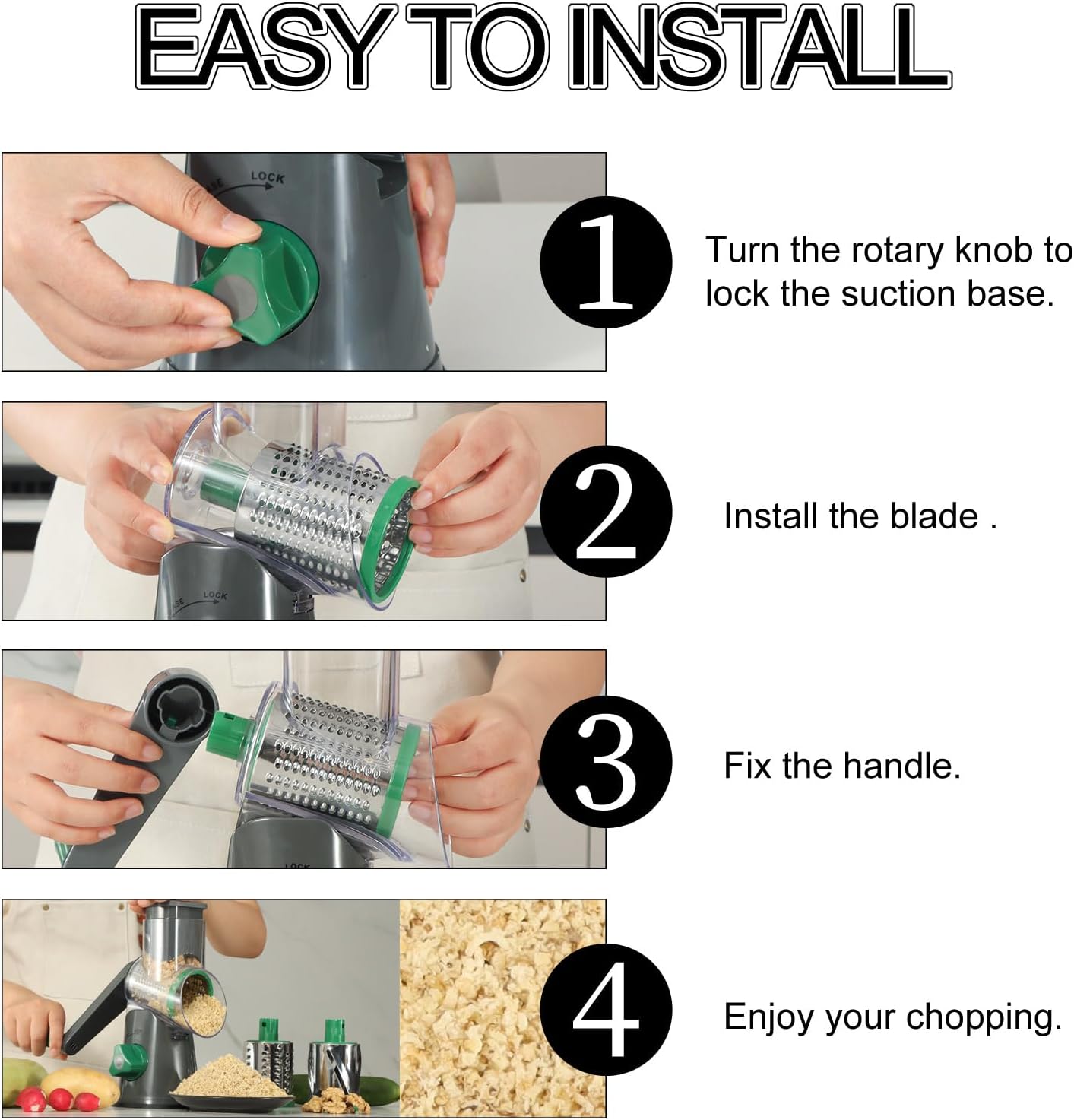 • Three blades for various kitchen needs: slicing, coarse shredding and fine shredding. The rotary grater is ideal for grating cheese, potato, carrot, cucumber, radish, nuts, chocolate, broccoli, etc. for pizza tops, cauliflower rice, hash brown and so on