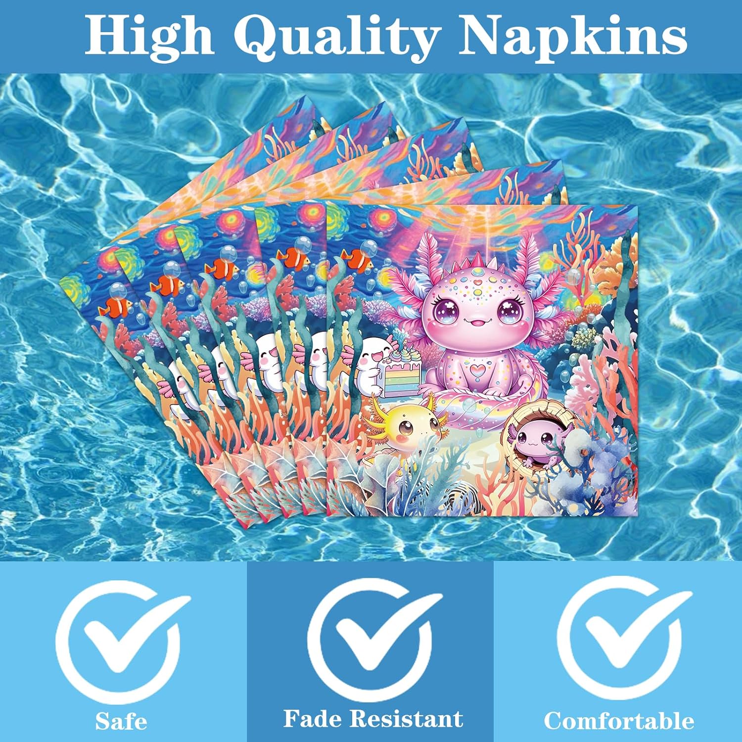 • High-Quality Materials: Made from sturdy paper, these axolotl birthday decorations resist bending and hold foods securely. The napkins are absorbent, and the prints maintain their vivid colors throughout your event