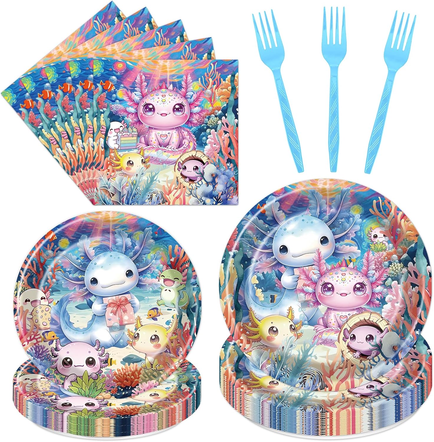 • Axolotl Party Decorations: This 96-piece set includes 24 pieces large plates, 24 pieces dessert plates, 24 pieces napkins, and 24 pieces forks, serving up to 24 guests. Featuring colorful axolotls in playful patterns, these decorations add vibrant charm to birthday celebrations or themed events