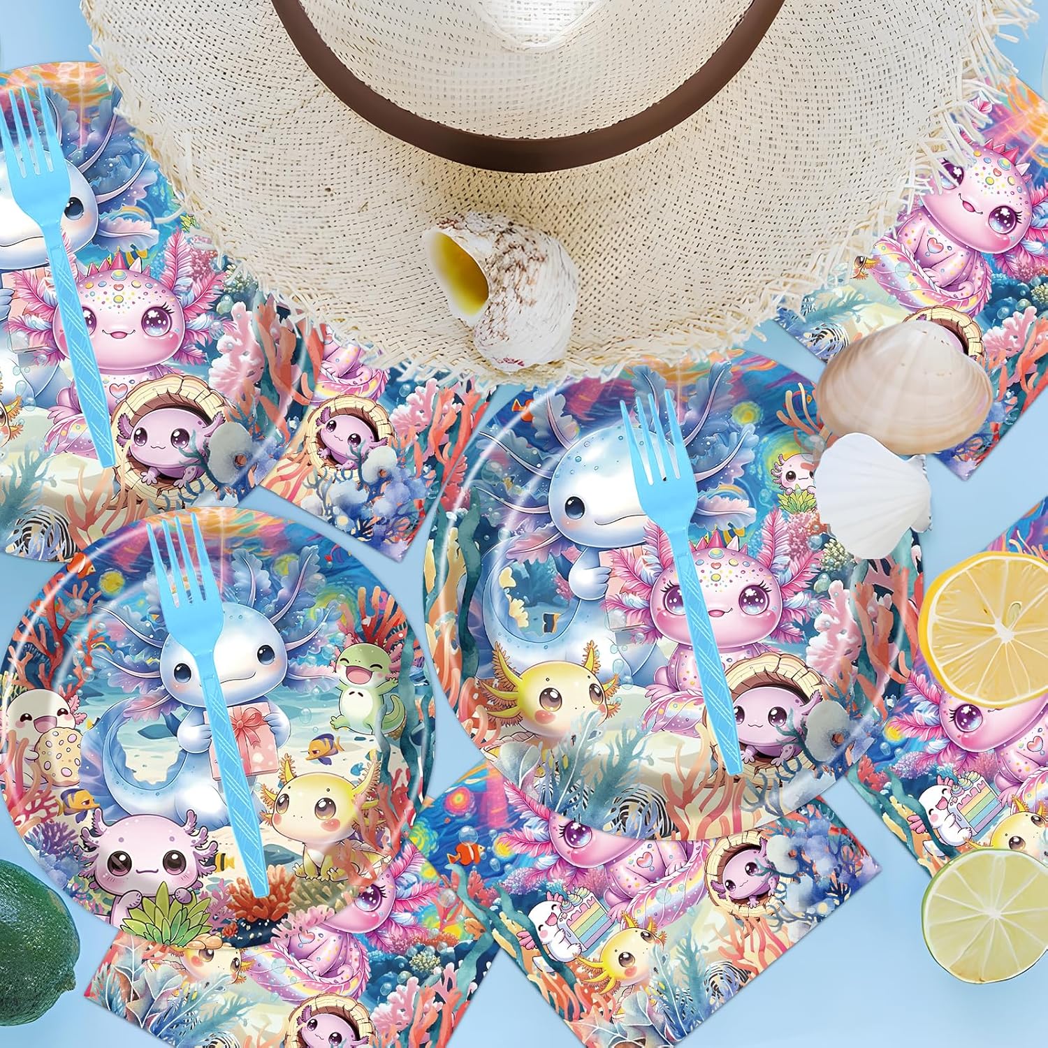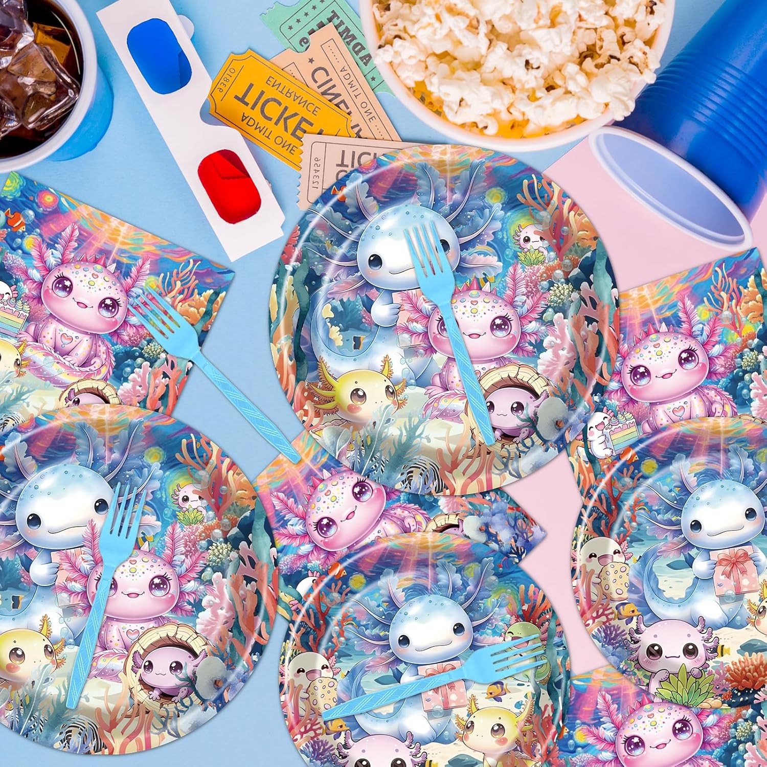 • Axolotl Theme Designs: Each piece showcases adorable axolotls in bright, eye-catching colors with aquatic-inspired details. The fun, cohesive patterns create a joyful atmosphere, ideal for kids’ birthdays or gatherings with animal-loving guests