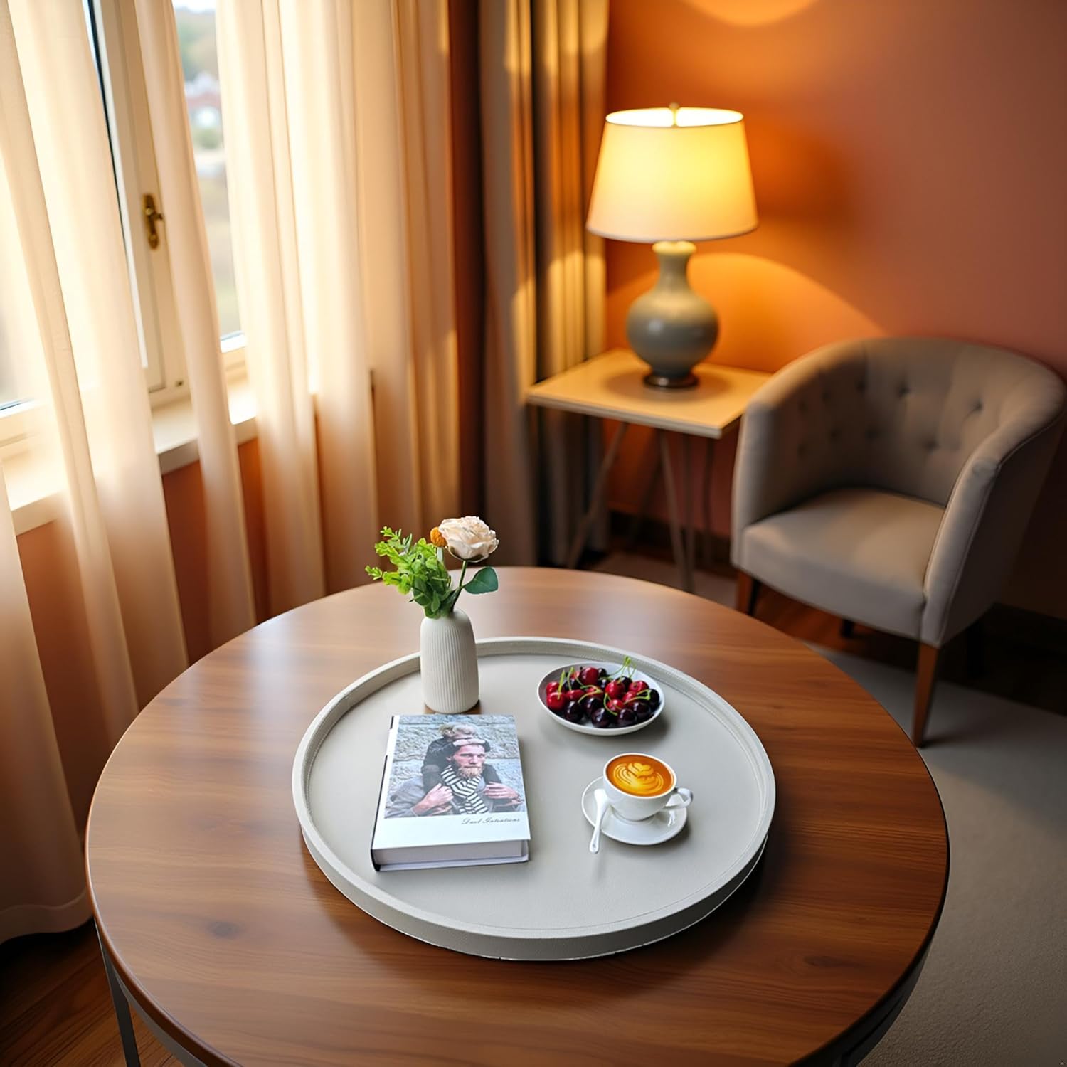 25-inch Round Ottoman Serving Tray - Textured PU Leather Coffee Table Decor, Waterproof Heat-Resistant Large Organizer for Home, Office, Bed & Party Essentials (Tranquil Beige, 25)